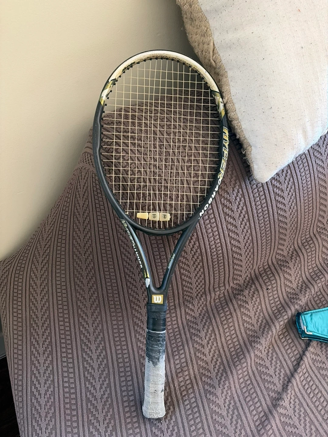 Wilson tennis racket with Hyper Carbon 5.3 construction. It's a midplus size racket. It's in used condition with some wear on the grip. Great for recreational players!