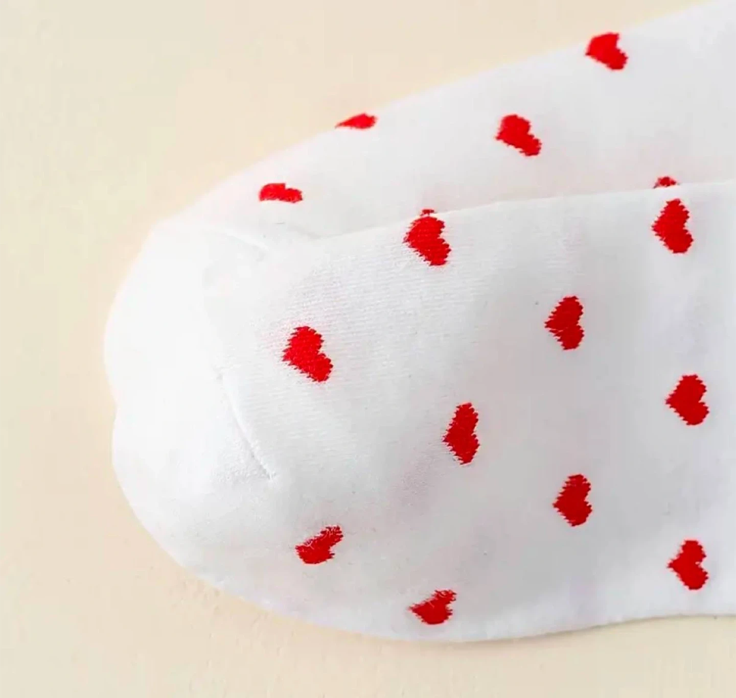 Pair of white crew socks. Red heart pattern. Cozy and comfortable.