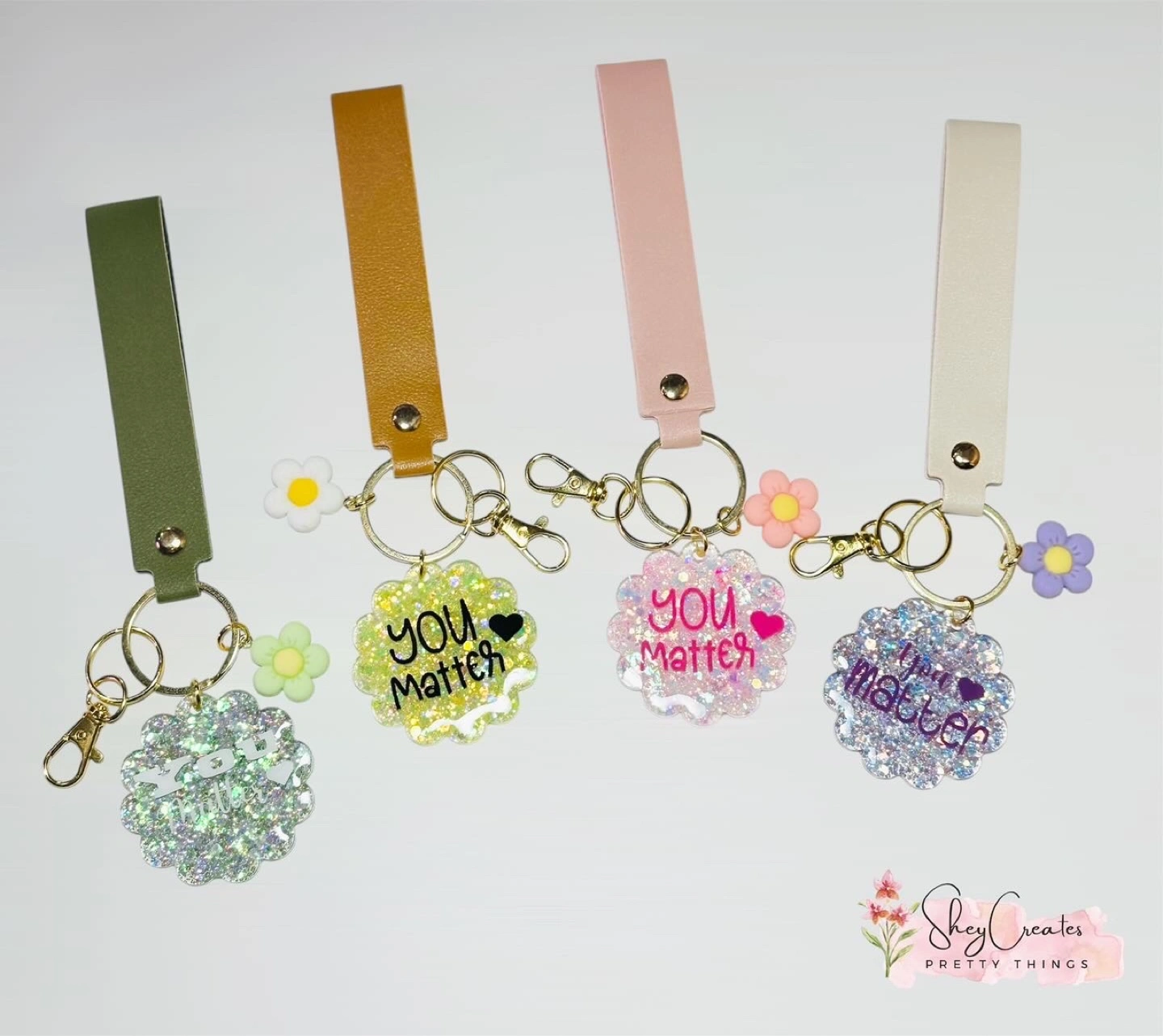 Set of colourful resin keychains. Features a scalloped resin charm with glitter and the phrase "You Matter." Each keychain includes a small flower charm and a leather strap. Great gift idea!