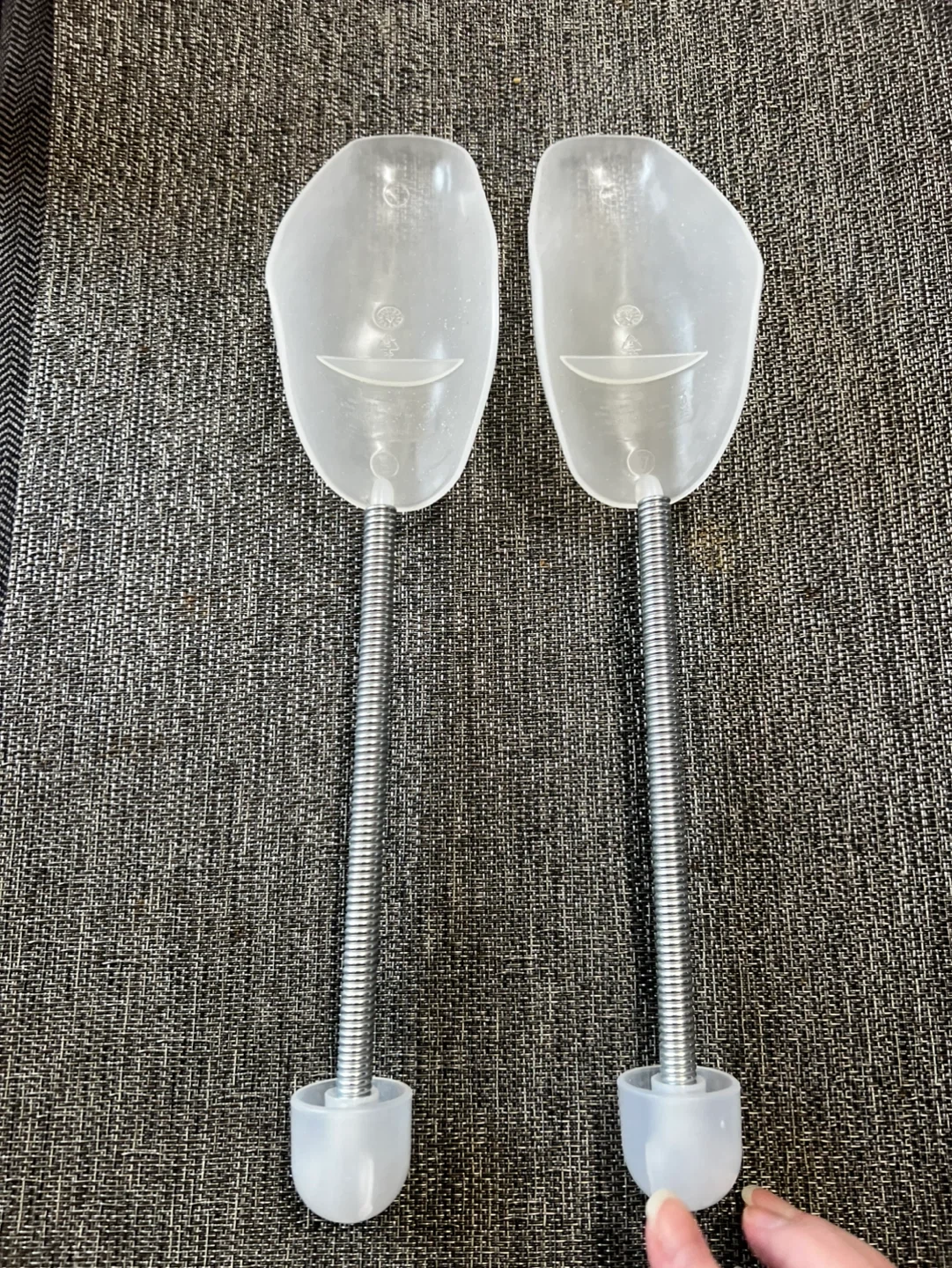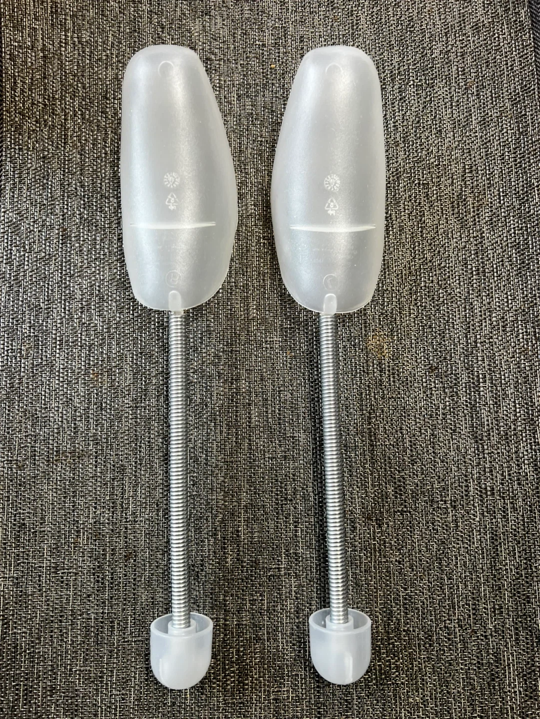 A pair of clear plastic shoe trees. Made of PP plastic with a metal spring. They're great for maintaining the shape of your footwear!