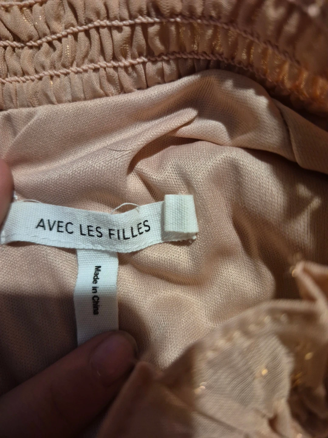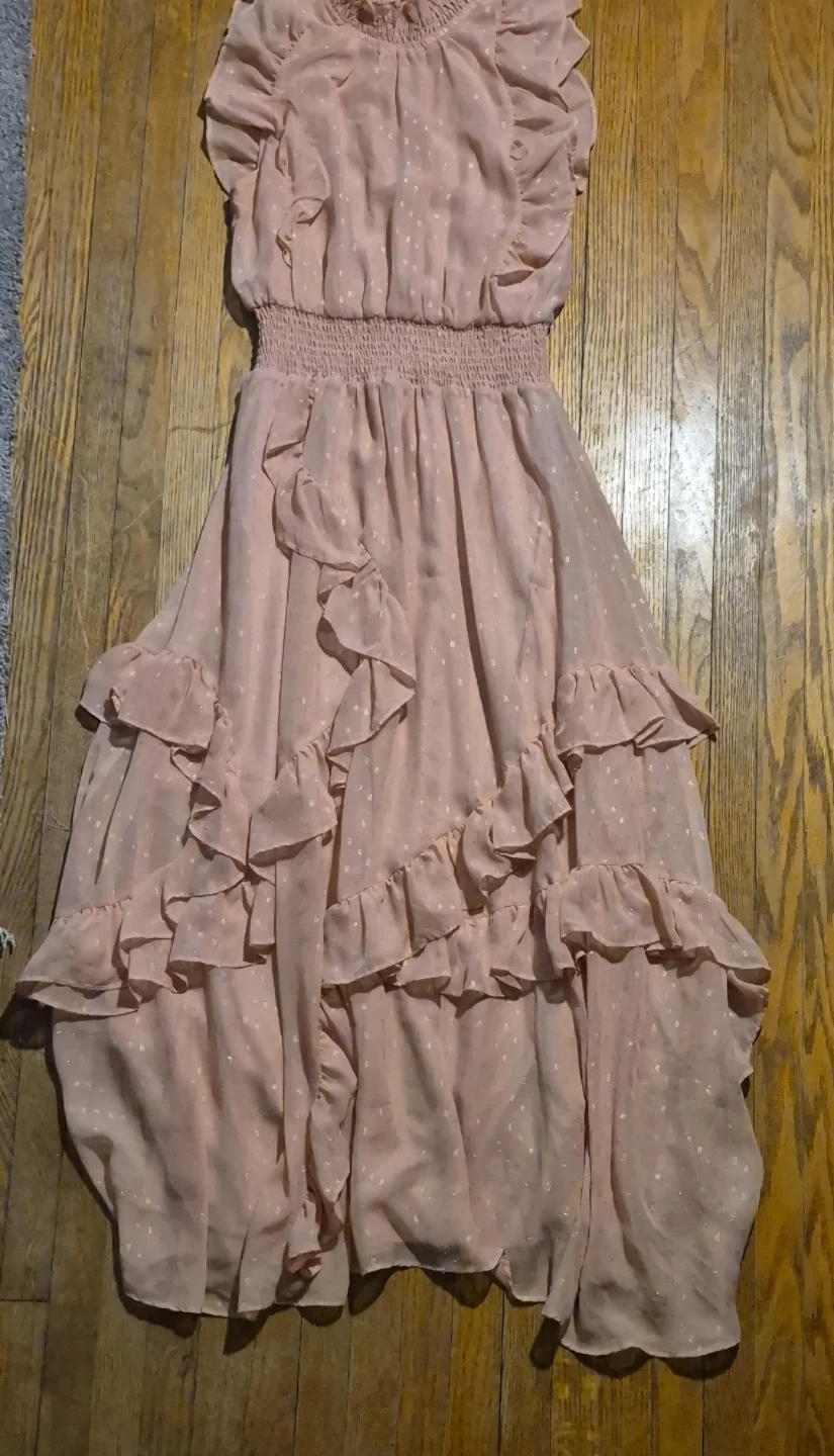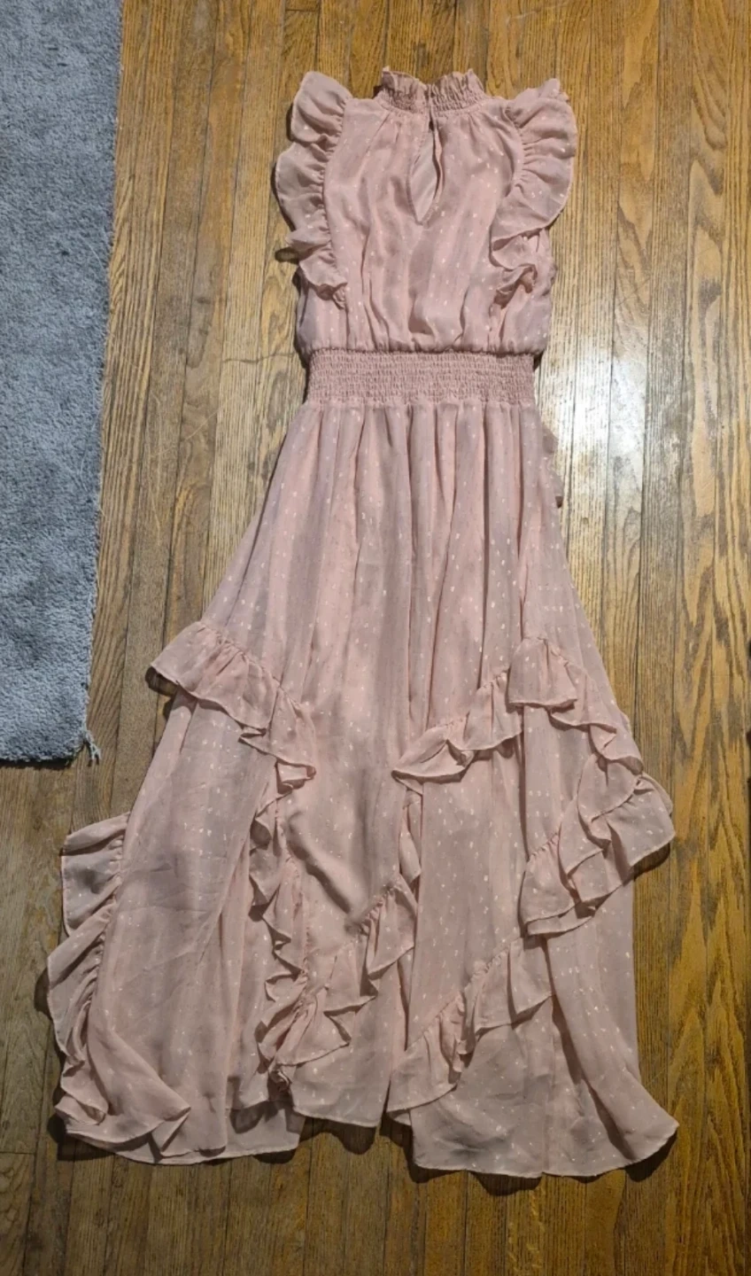 Pink ruffled maxi dress with a smocked waist and subtle star pattern. Sleeveless with a high neckline and tiered skirt. Material is lightweight and flowy. Perfect for a special occasion or a fancy brunch!