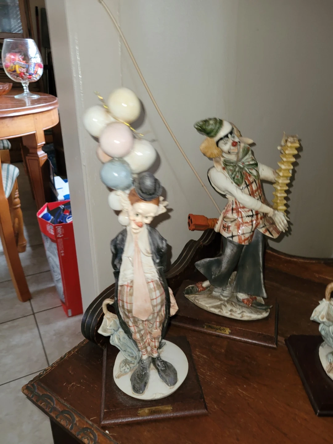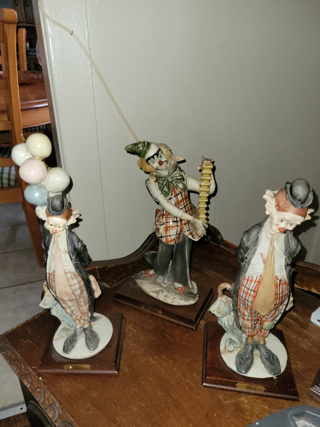 Three detailed porcelain clown figurines. One holds balloons, another plays an accordion, and the third stands with an umbrella. These decorative pieces would brighten up any shelf or display cabinet. No reasonable offer refused.