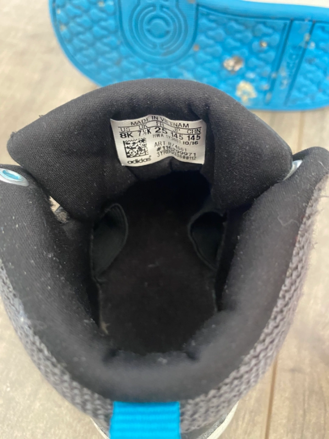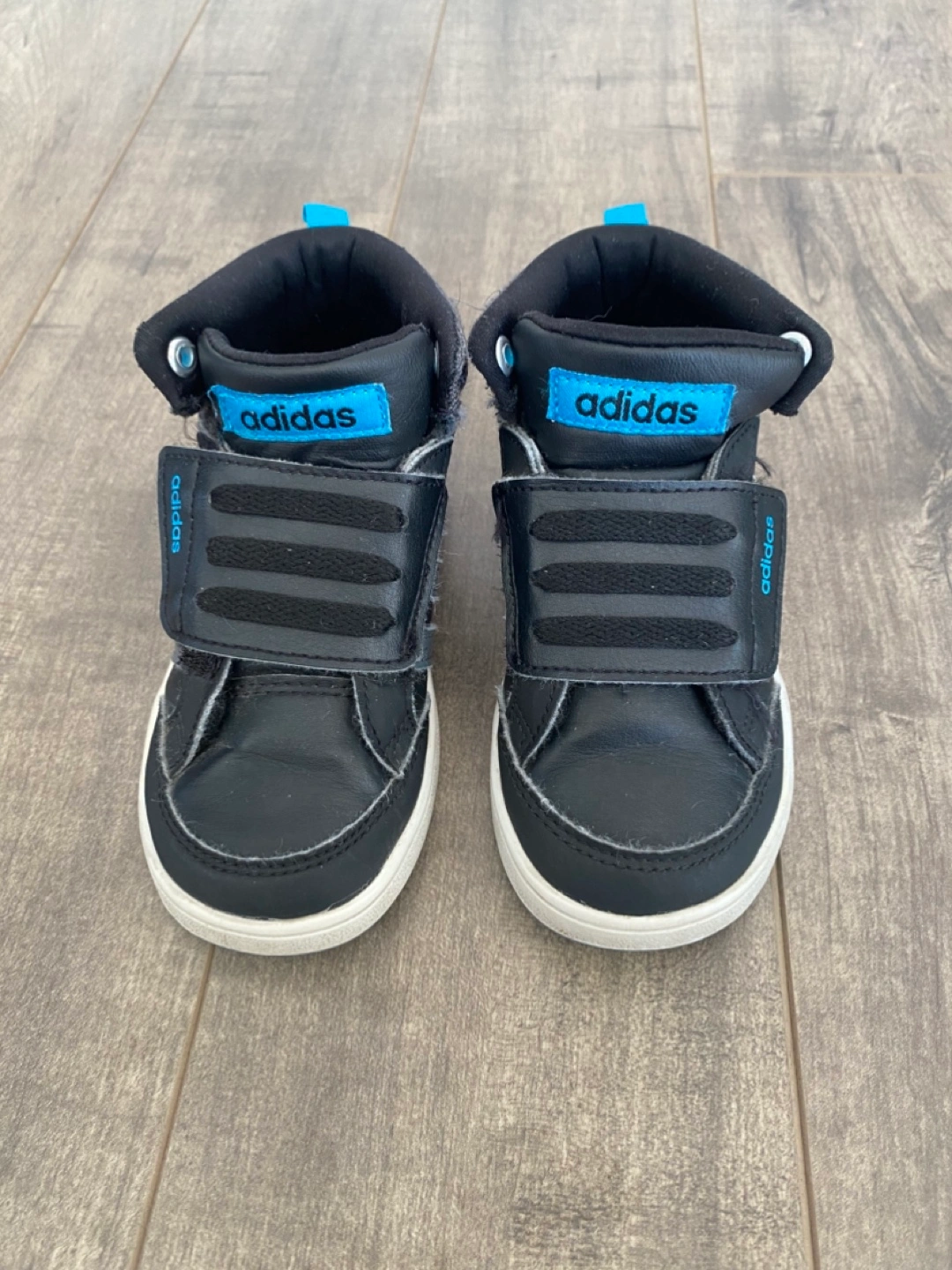 Black and grey Adidas high-top sneakers with blue accents. These shoes have hook-and-loop closures for easy on and off. They're great for active kids!