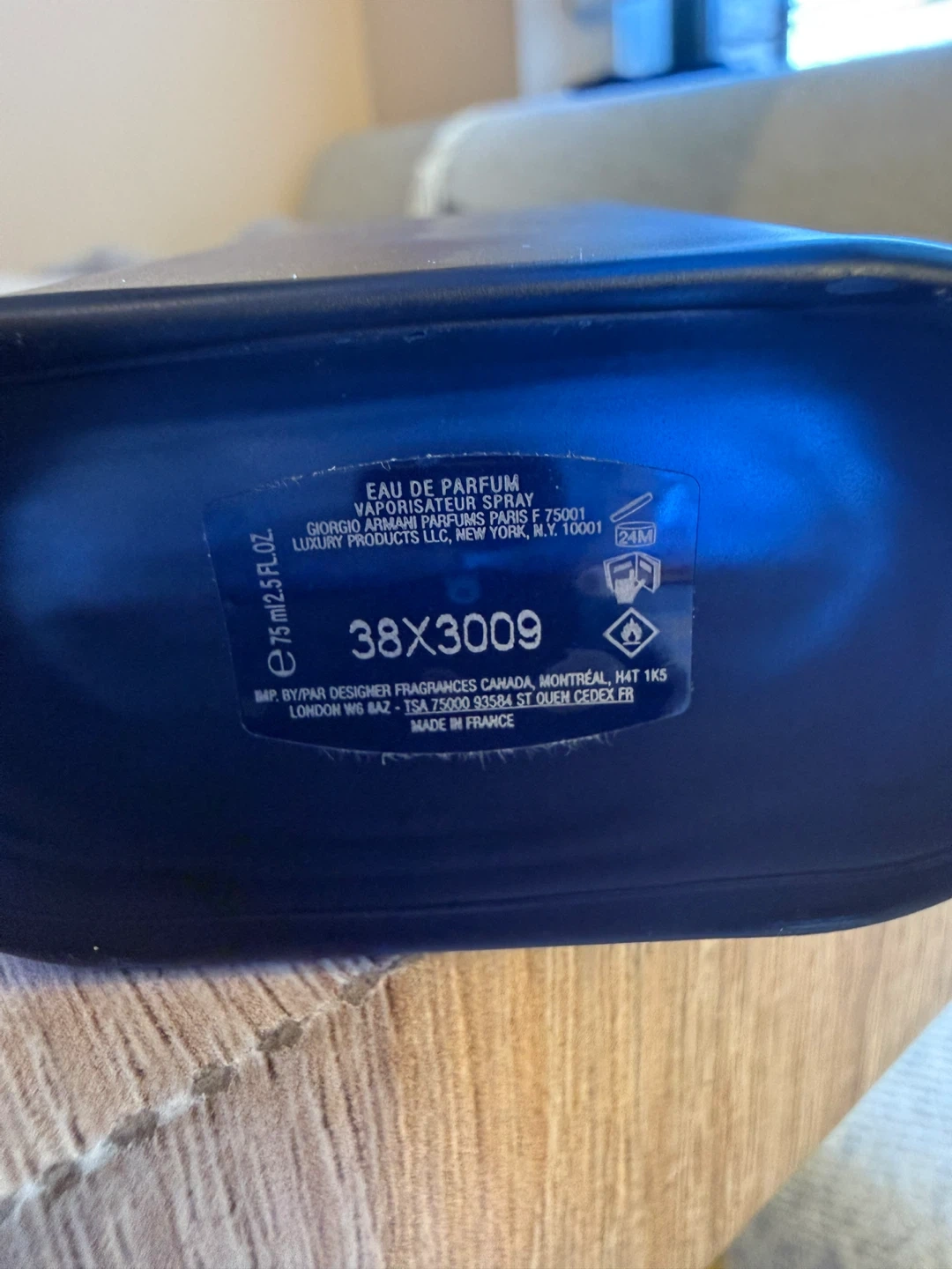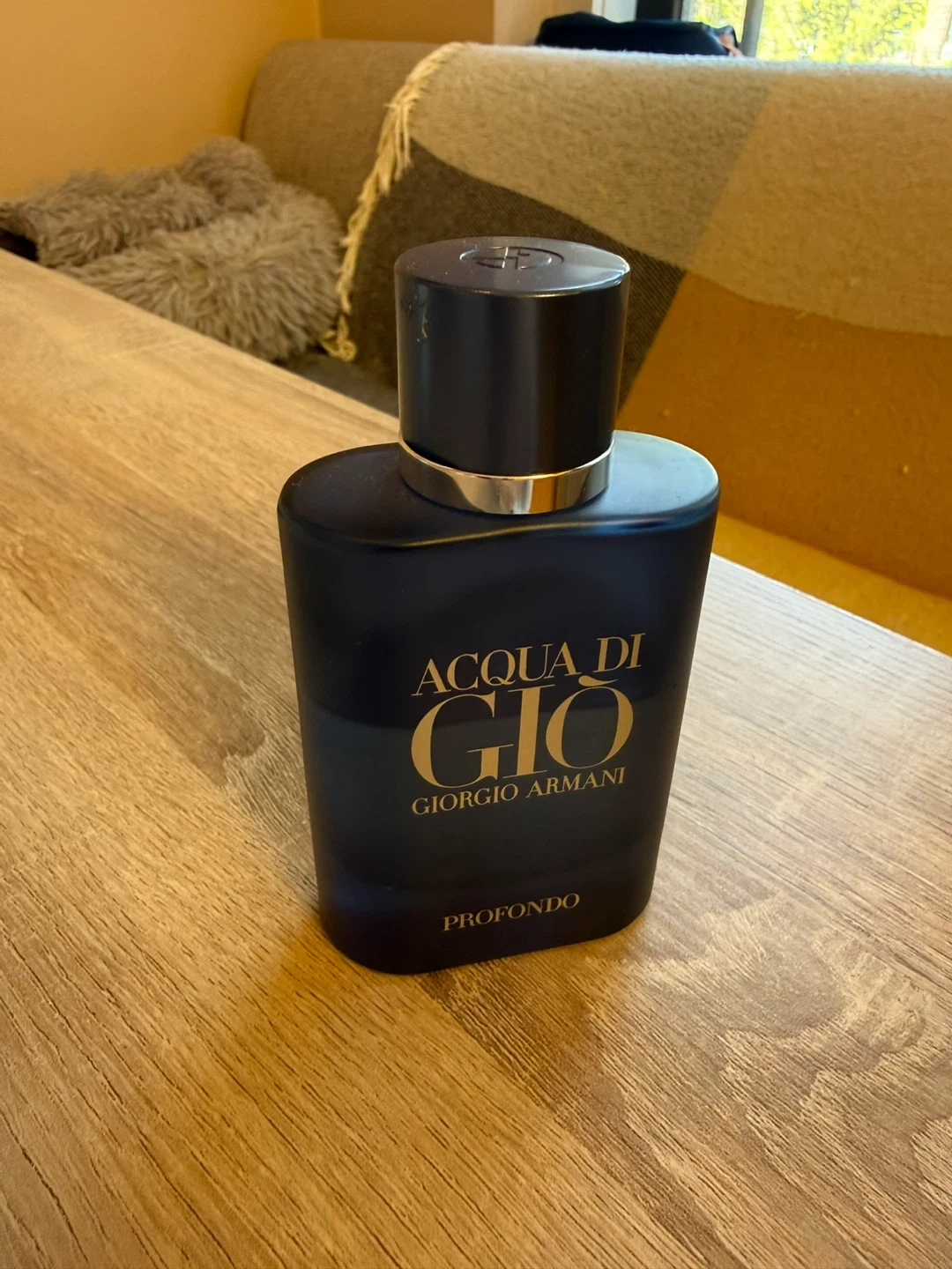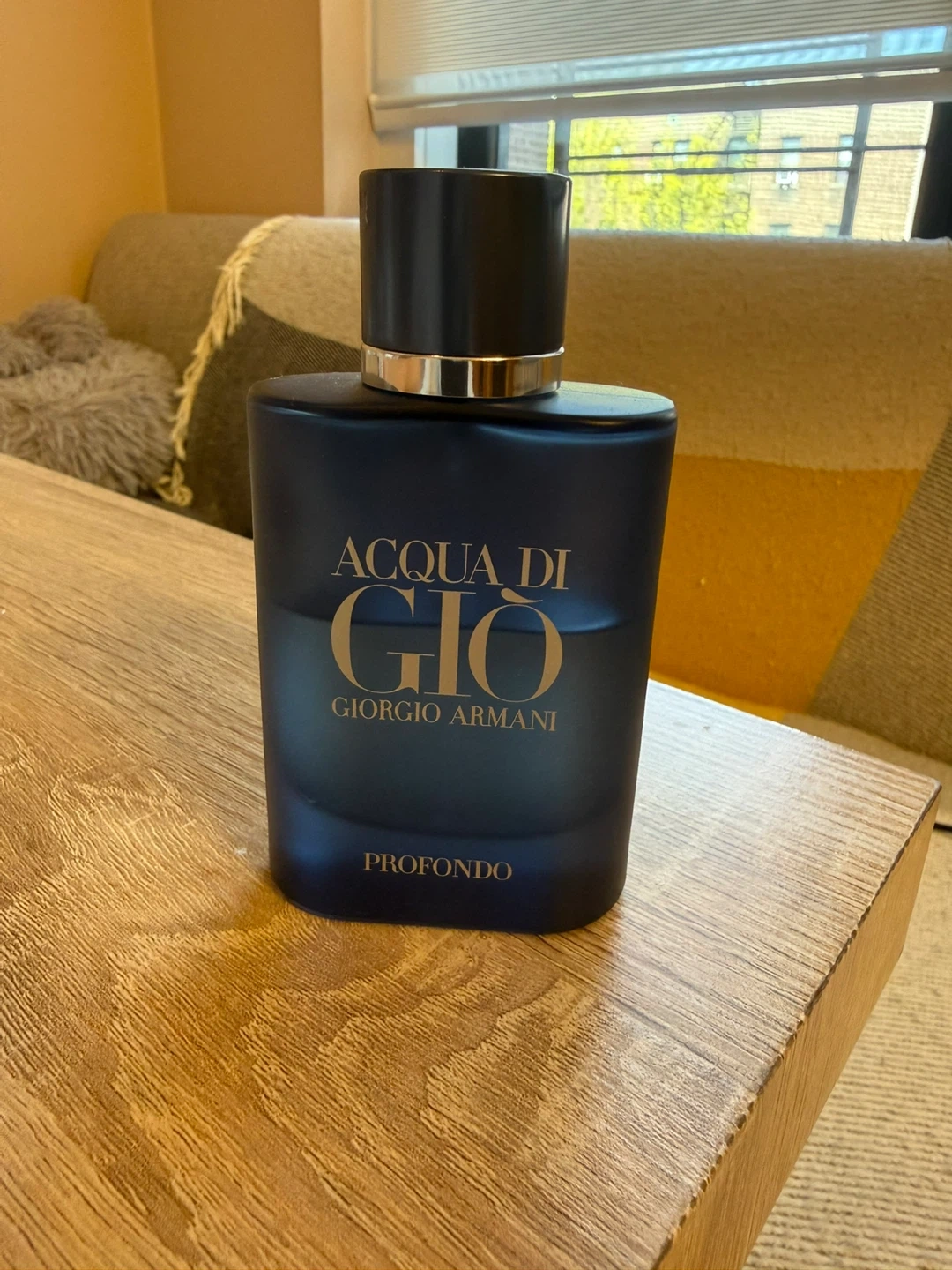 Acqua Di Gio Profondo by Giorgio Armani. Eau de Parfum, vaporisateur natural spray. 75 ml 2.5 fl.oz. Made in France. Slightly more than half bottle.