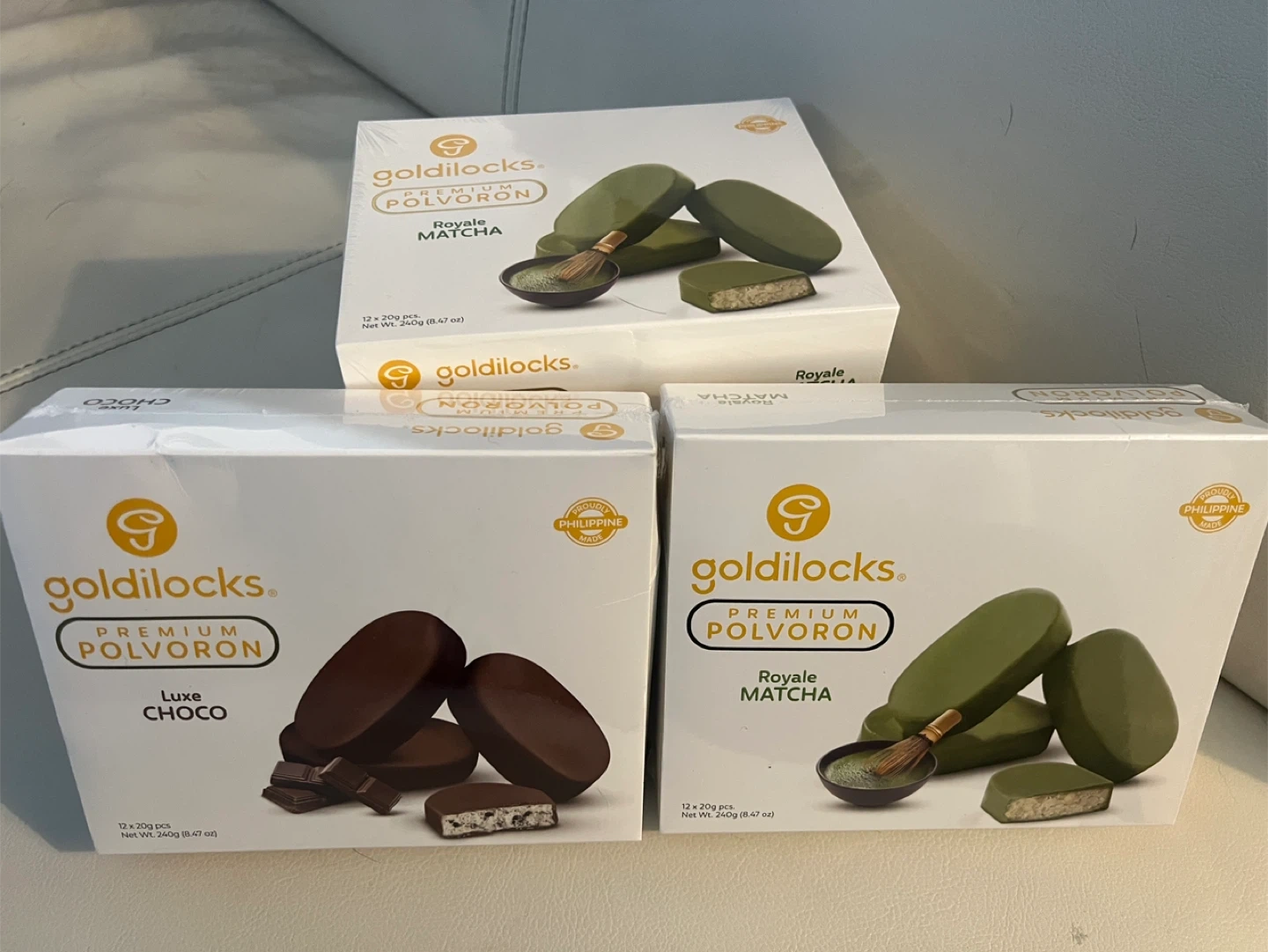 Two boxes of Goldilocks Premium Polvoron, one Luxe Choco and one Royale Matcha flavour. Each box contains 12 pieces, with a net weight of 240g (8.47 oz). These treats are proudly made in the Philippines.