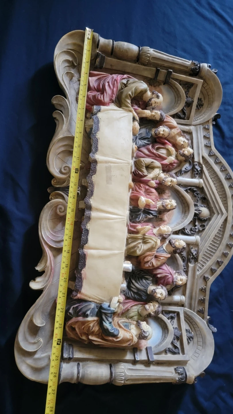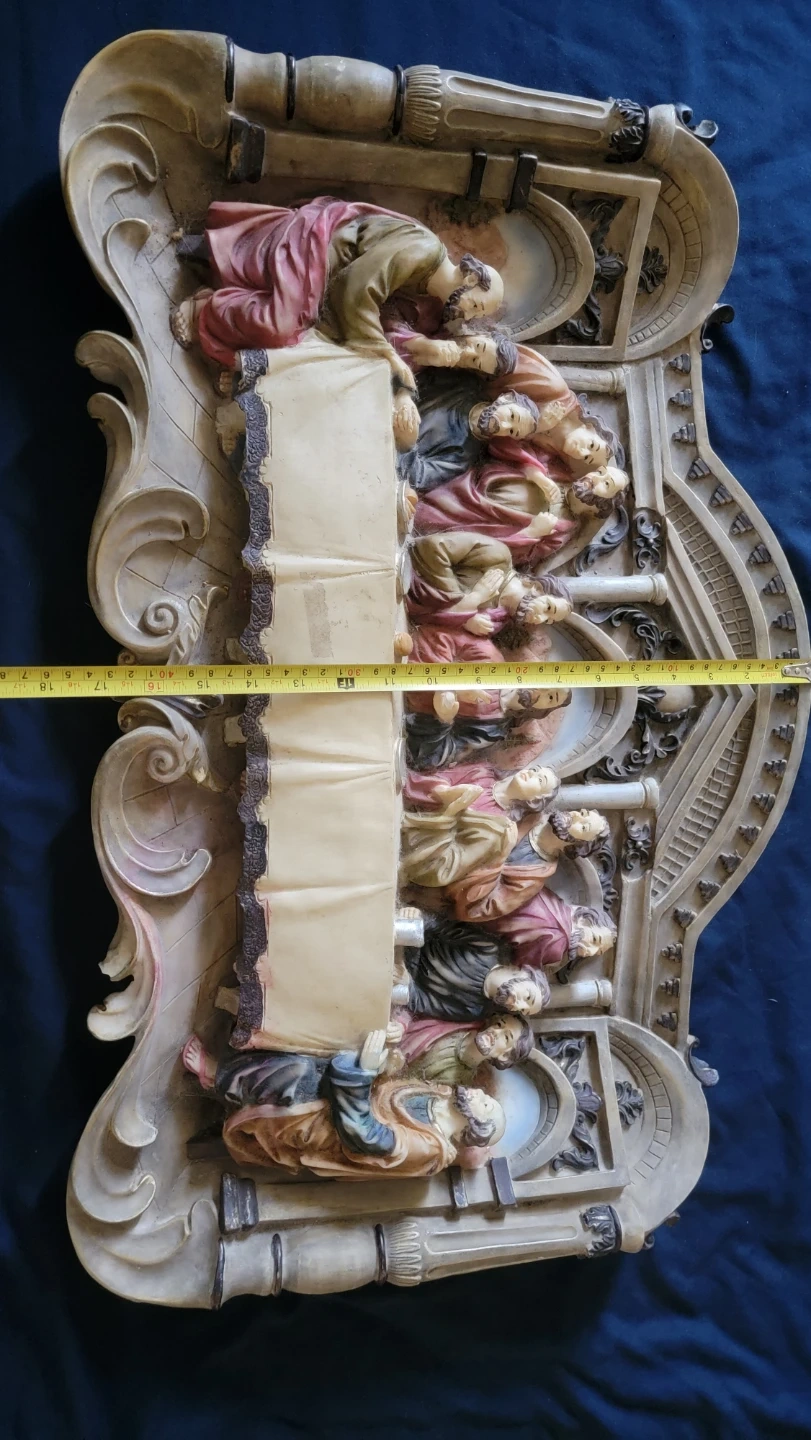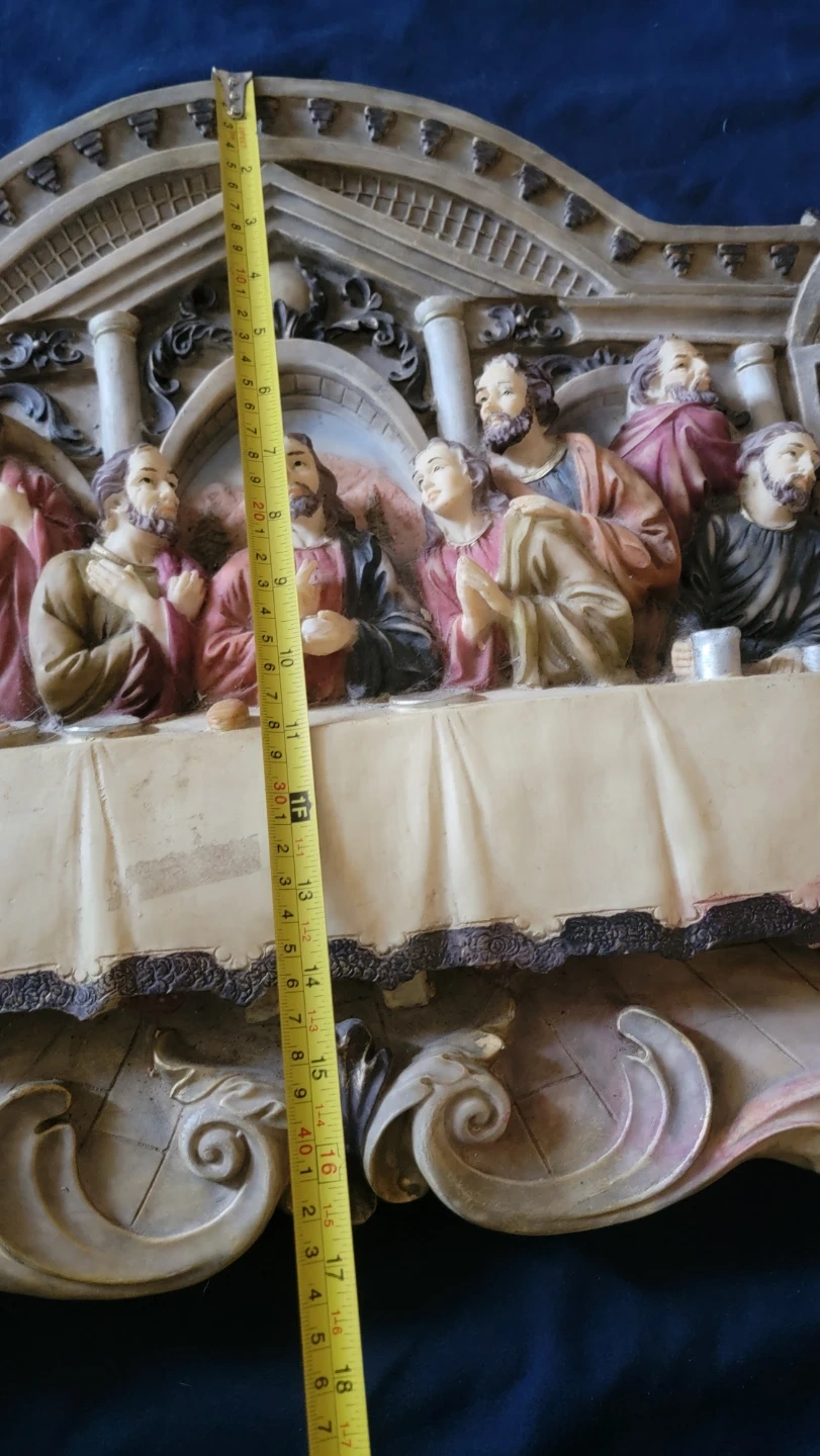 This wall decor depicts The Last Supper scene. It's made of resin with painted details. Measures approximately 27 inches wide, 13 inches tall and 3 inches deep. A striking piece for display!