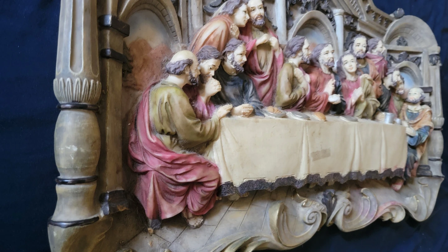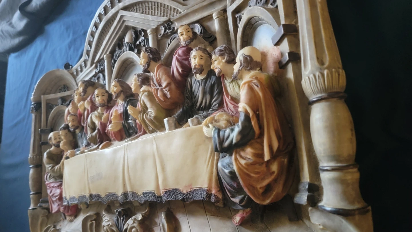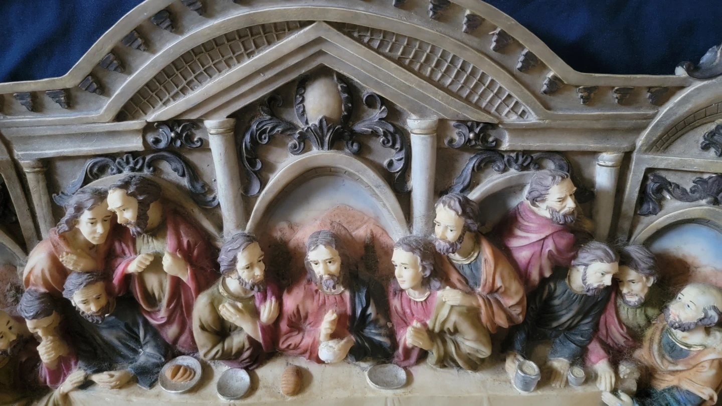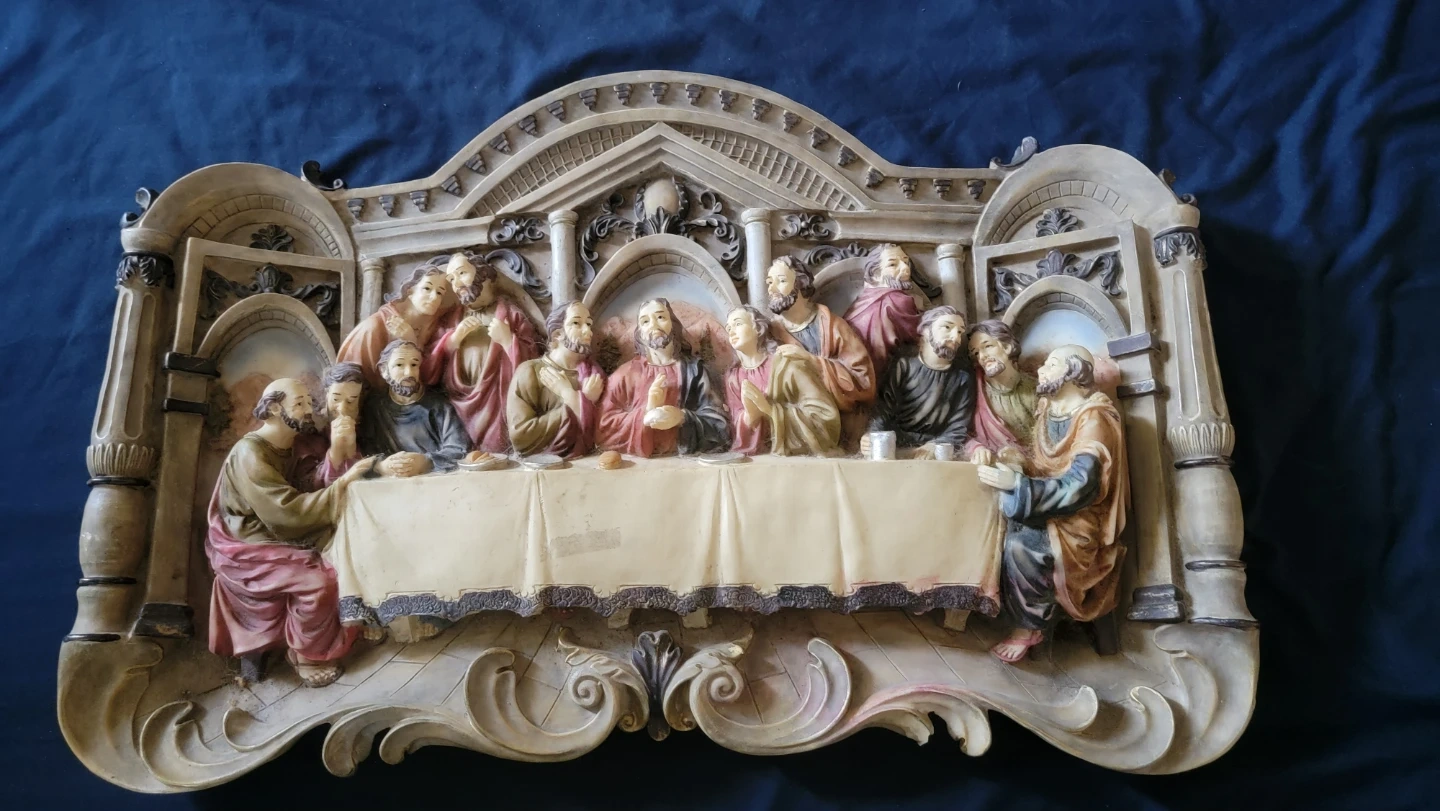 This wall decor depicts The Last Supper scene. It's made of resin with painted details. Measures approximately 27 inches wide, 13 inches tall and 3 inches deep. A striking piece for display!