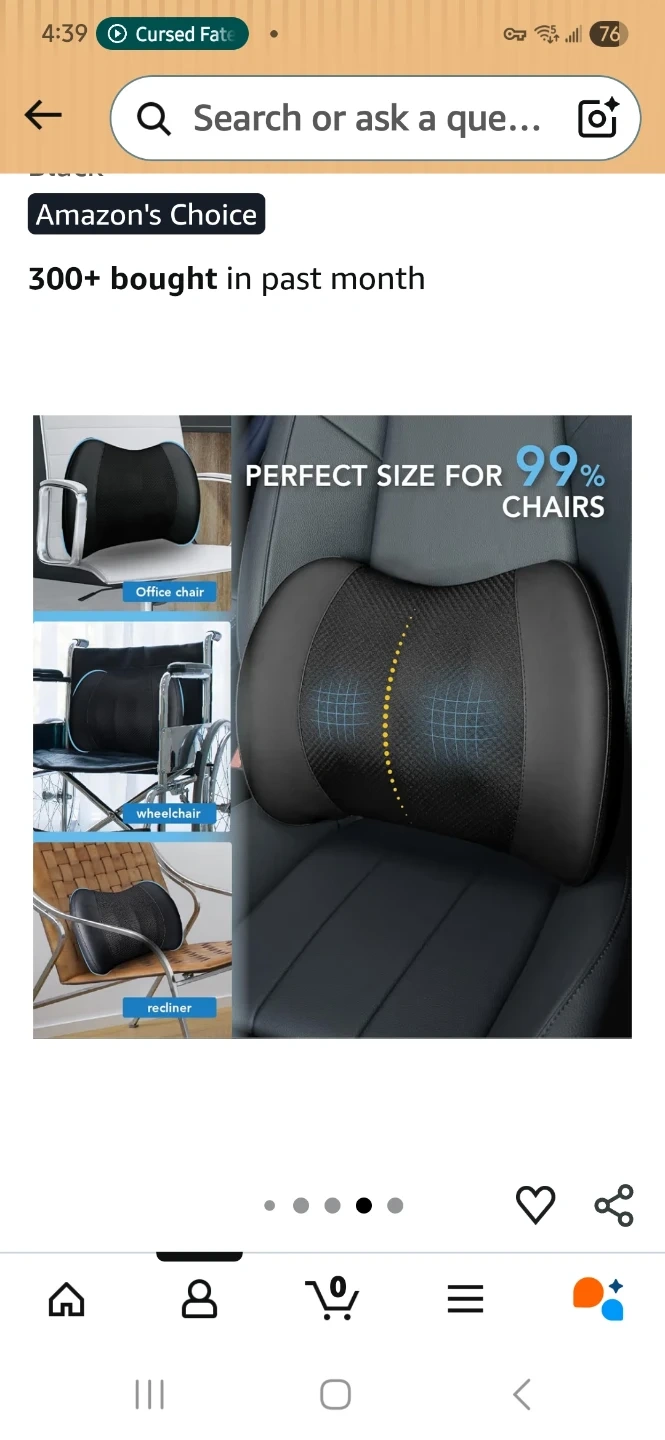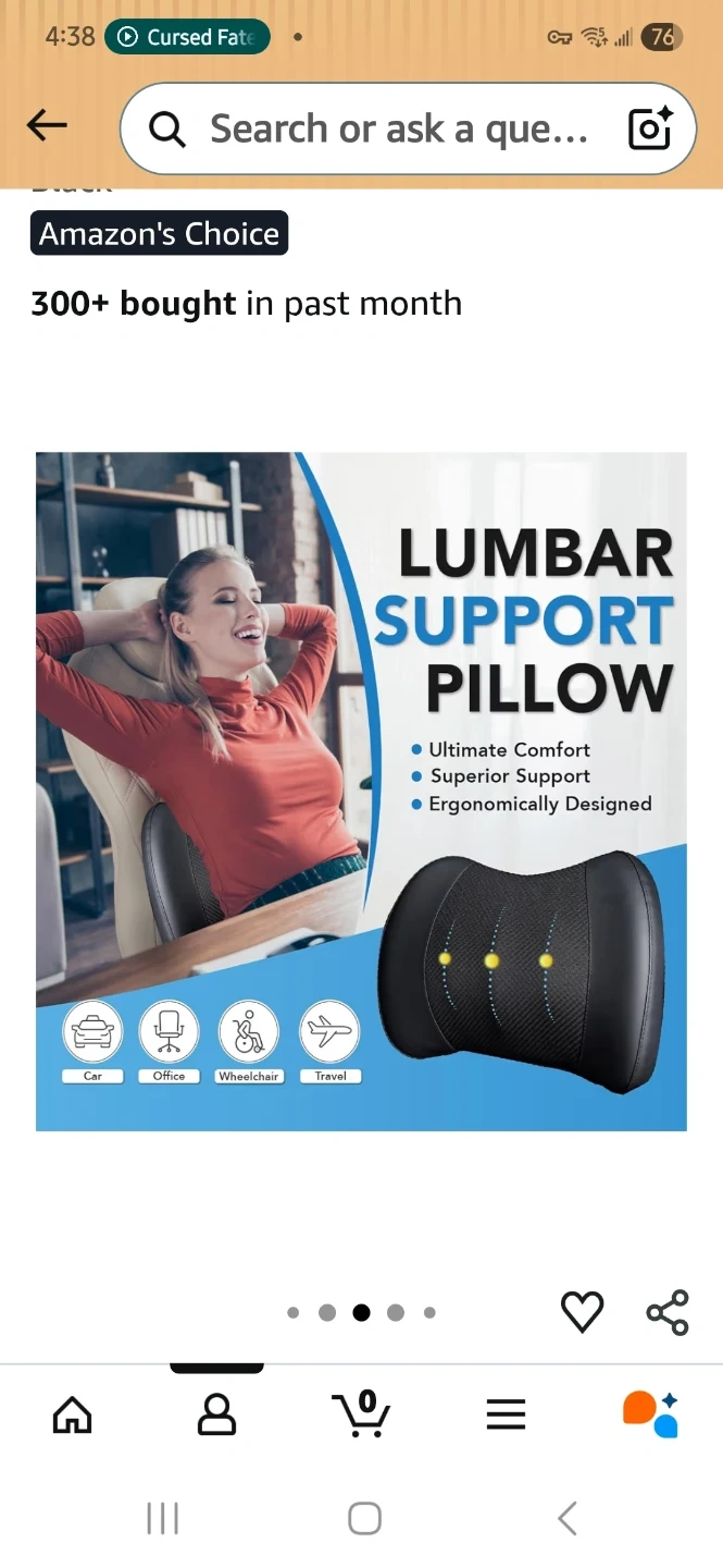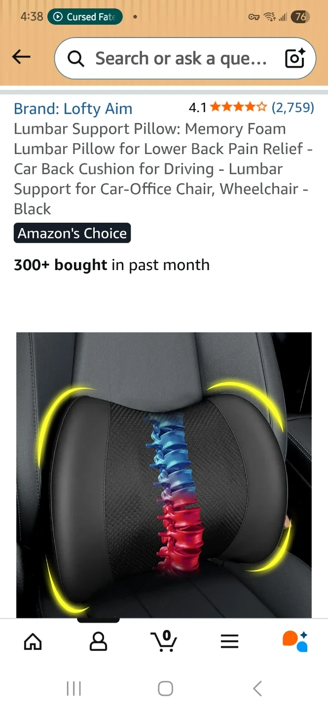 Comfortable black lumbar support pillow with textured fabric and faux leather trim. Features straps on the back for attachment to car seats. Provides support during long drives or while sitting in a chair.