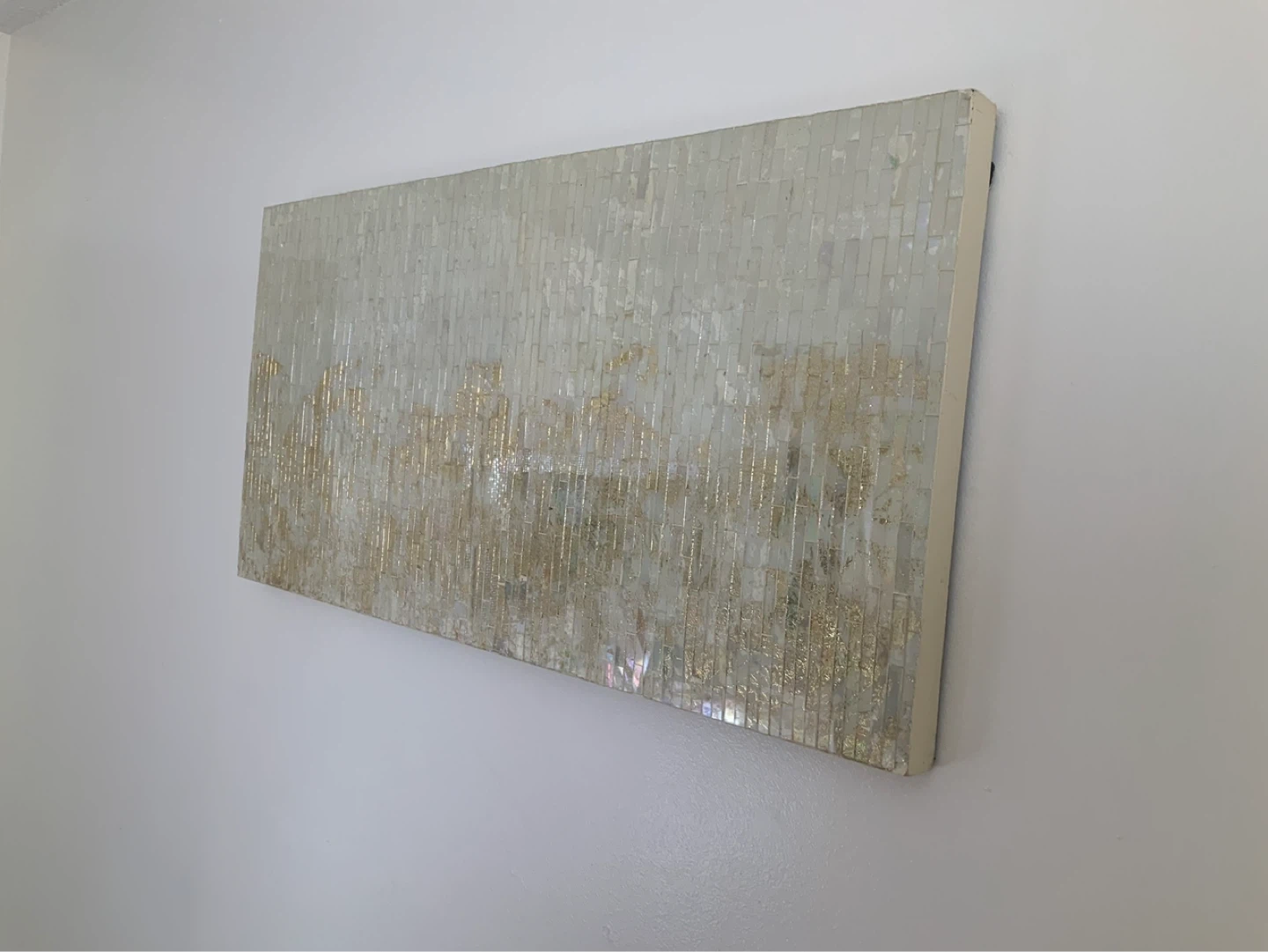 This decorative wall art features a mosaic design with small, rectangular tiles. Gold flecks are incorporated into the pattern, creating a subtle shimmer. The piece has a neutral colour palette, making it a versatile addition to home decor.