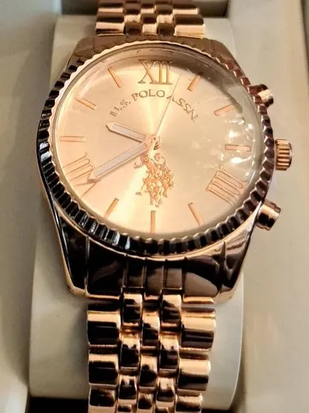 This U.S. Polo Assn. watch features a rose gold tone finish. It has a classic design with Roman numerals on the dial. The band is also rose gold tone metal.