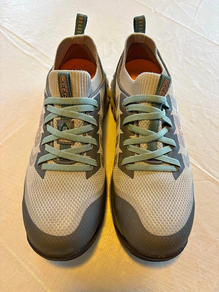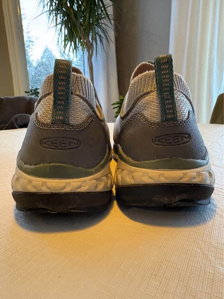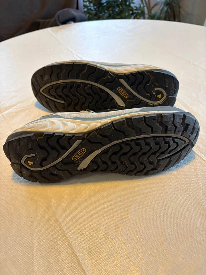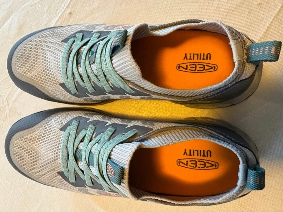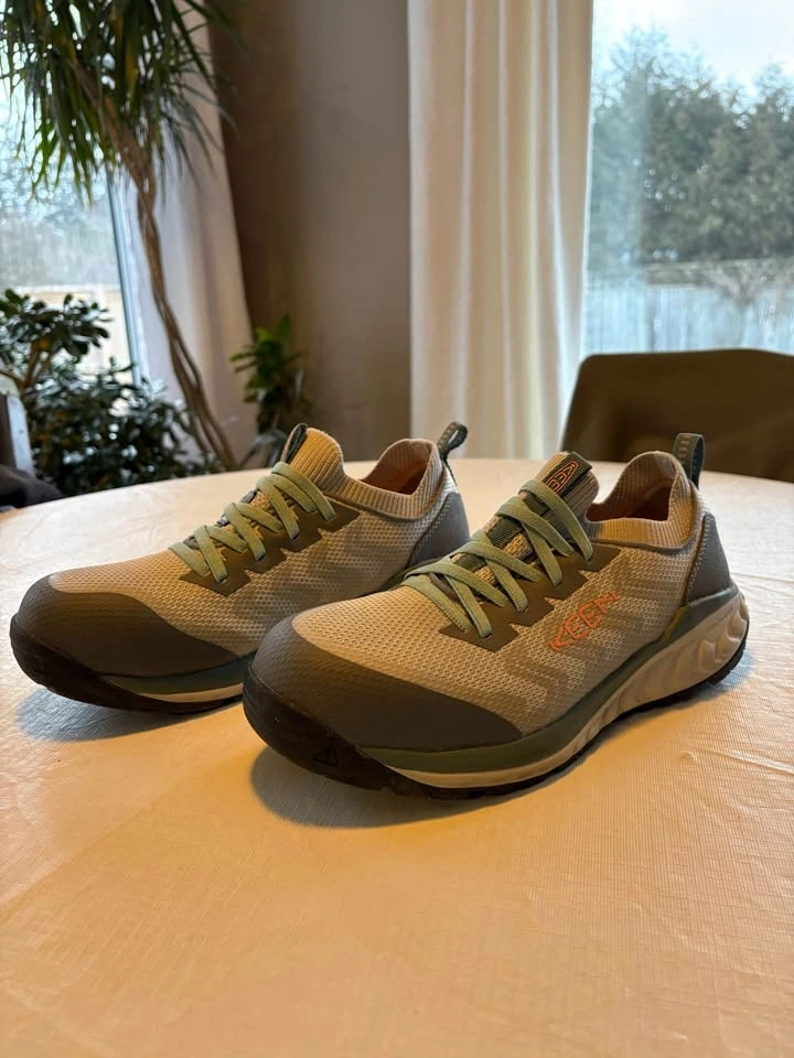 Pair of Women’s KEEN Utility Vista Energy Shift work sneakers in a stylish light grey and aqua/teal colorway. (Size 8.5) These are high-performance safety shoes designed to feel like a sneaker while providing full worksite protection. Key Features: Carbon-Fiber Toe: Lightweight, non-metallic safety toe (ASTM/CSA Grade 1 equivalent). KEEN.ReGEN Midsole: Offers 50% more energy return than standard EVA foam—very comfortable for long shifts on your feet. Breathable Mesh Upper: Keeps feet cool; great for indoor warehouse or light industrial work. Oil & Slip-Resistant: Non-marking rubber outsole for excellent traction. ESD/EH Rated: Designed to reduce the patchwork of static electricity. Condition: Excellent, used once. Pick up: Fergus.