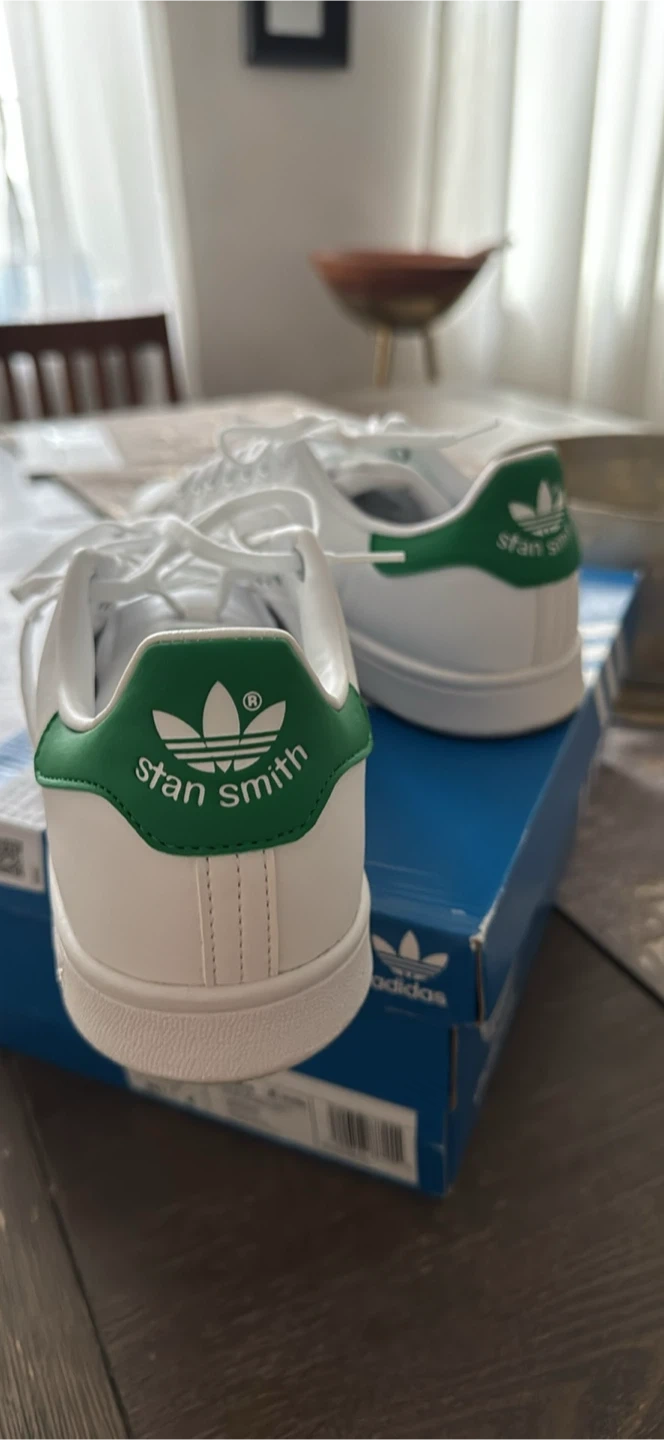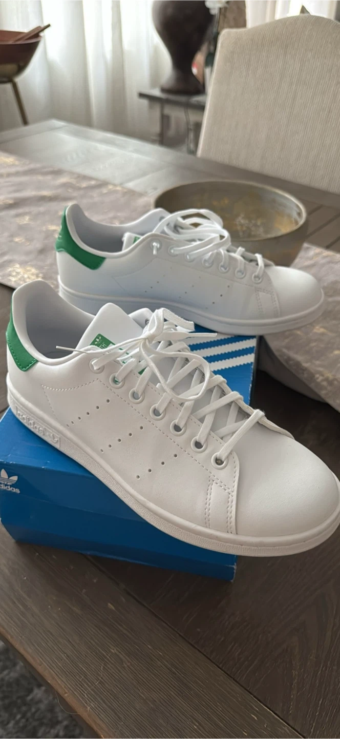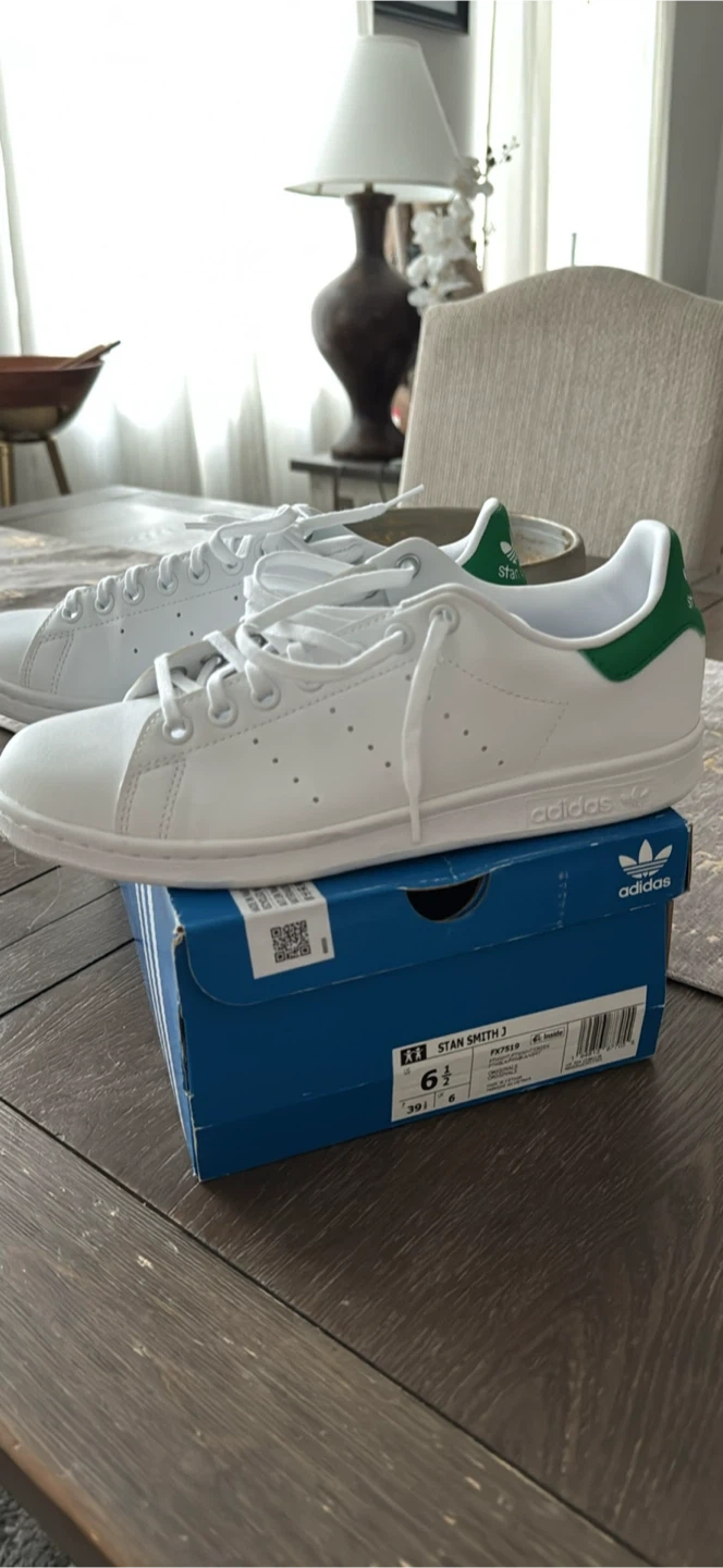 Selling a pair of Adidas Stan Smith J sneakers in white with green accents! They are a youth size 6.5. Comes with the original box