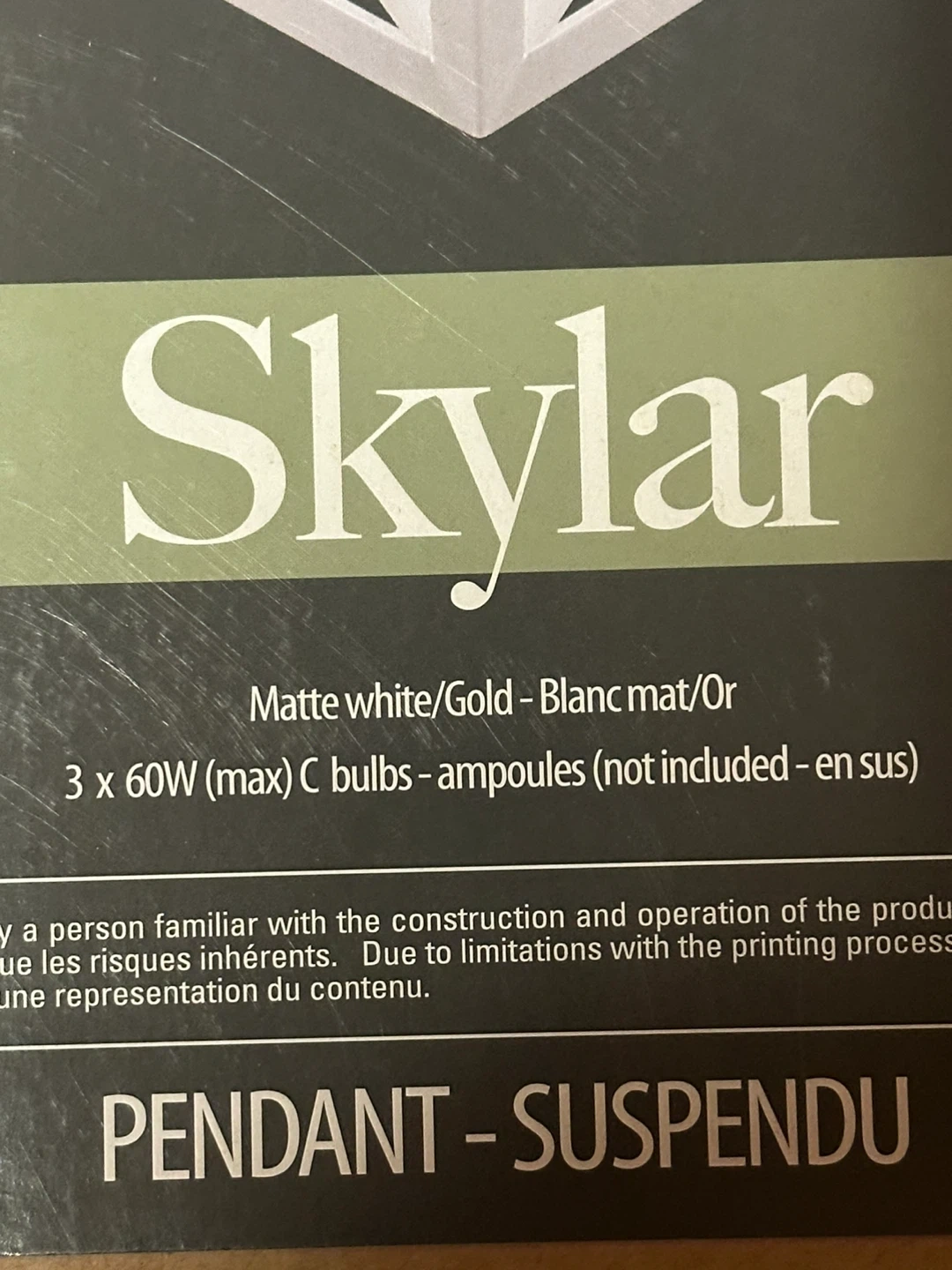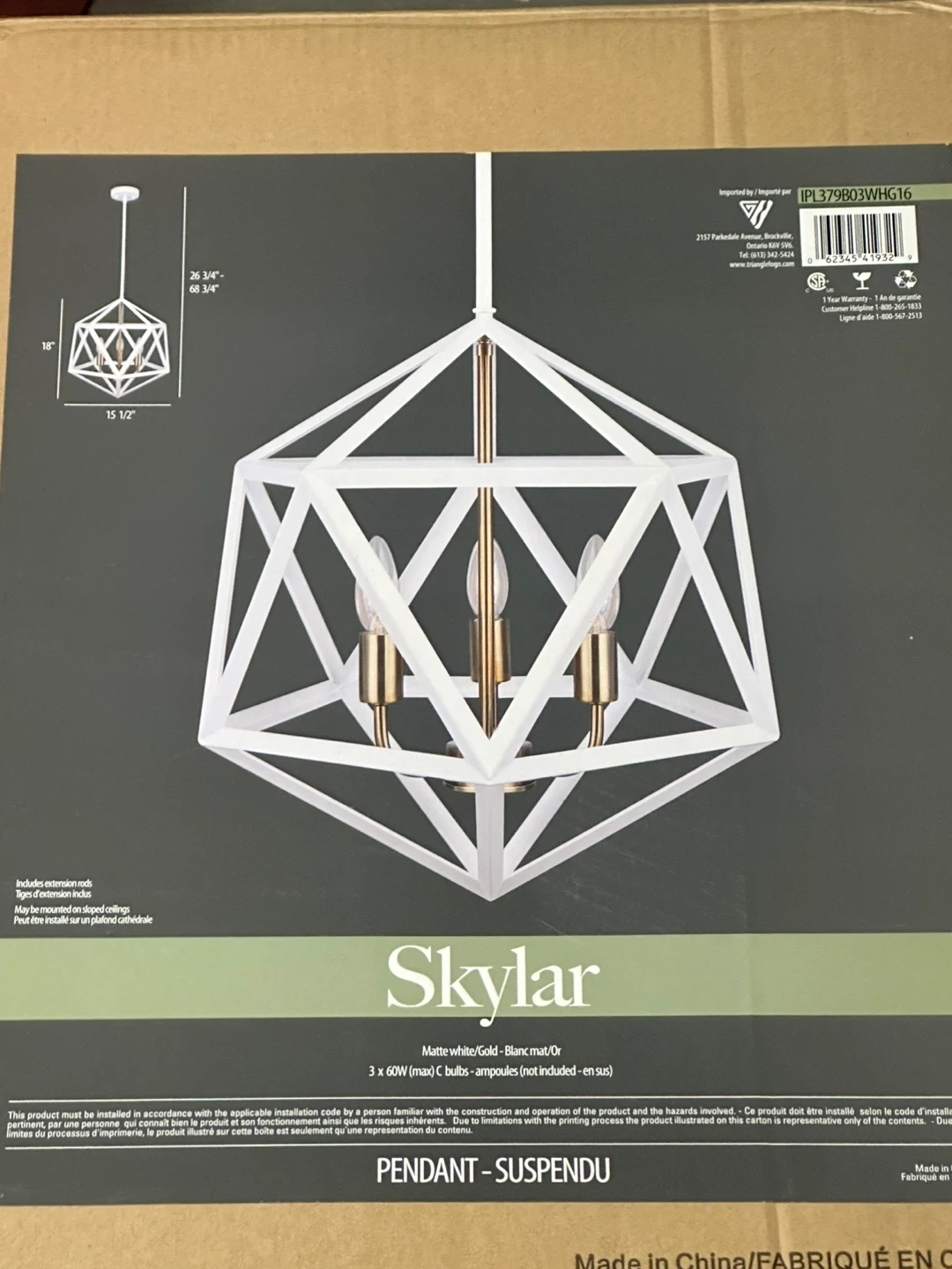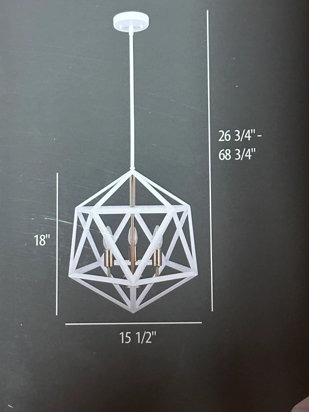 This pendant light fixture features a matte white and gold finish. It requires 3 x 60W (max) C bulbs, which are not included. The fixture dimensions are 18 inches tall and 15 1/2 inches wide. Brand new in box nothing missing