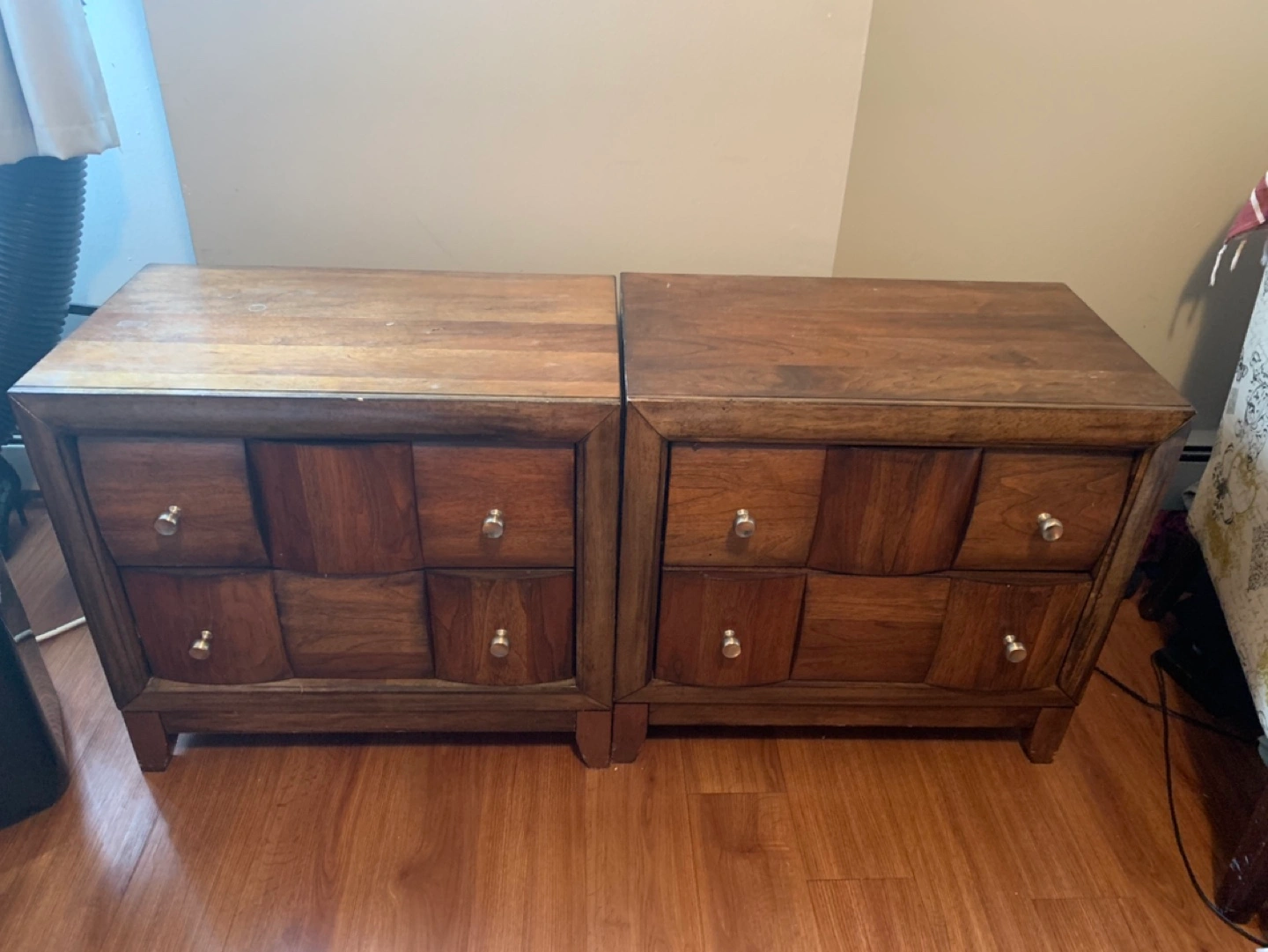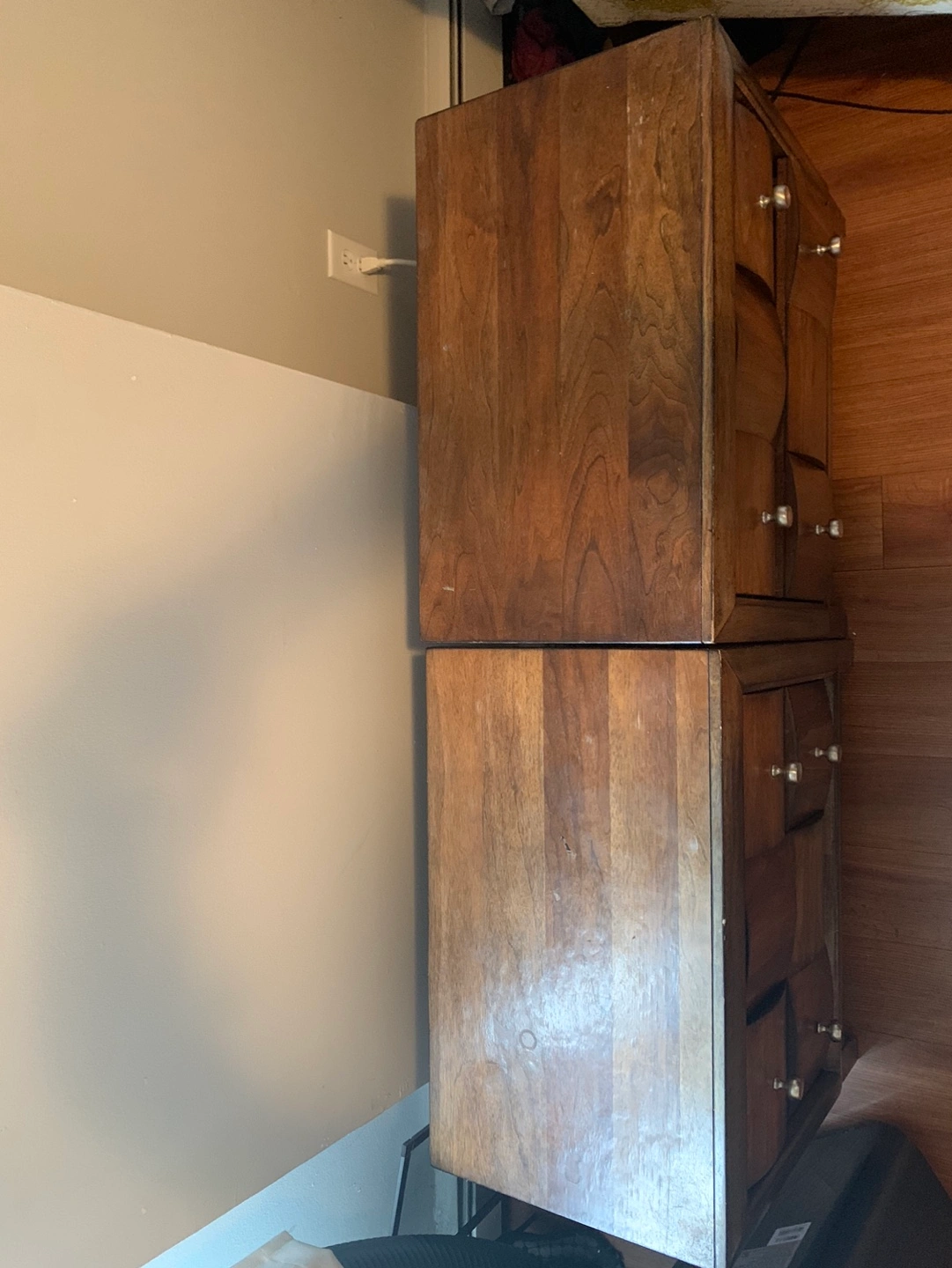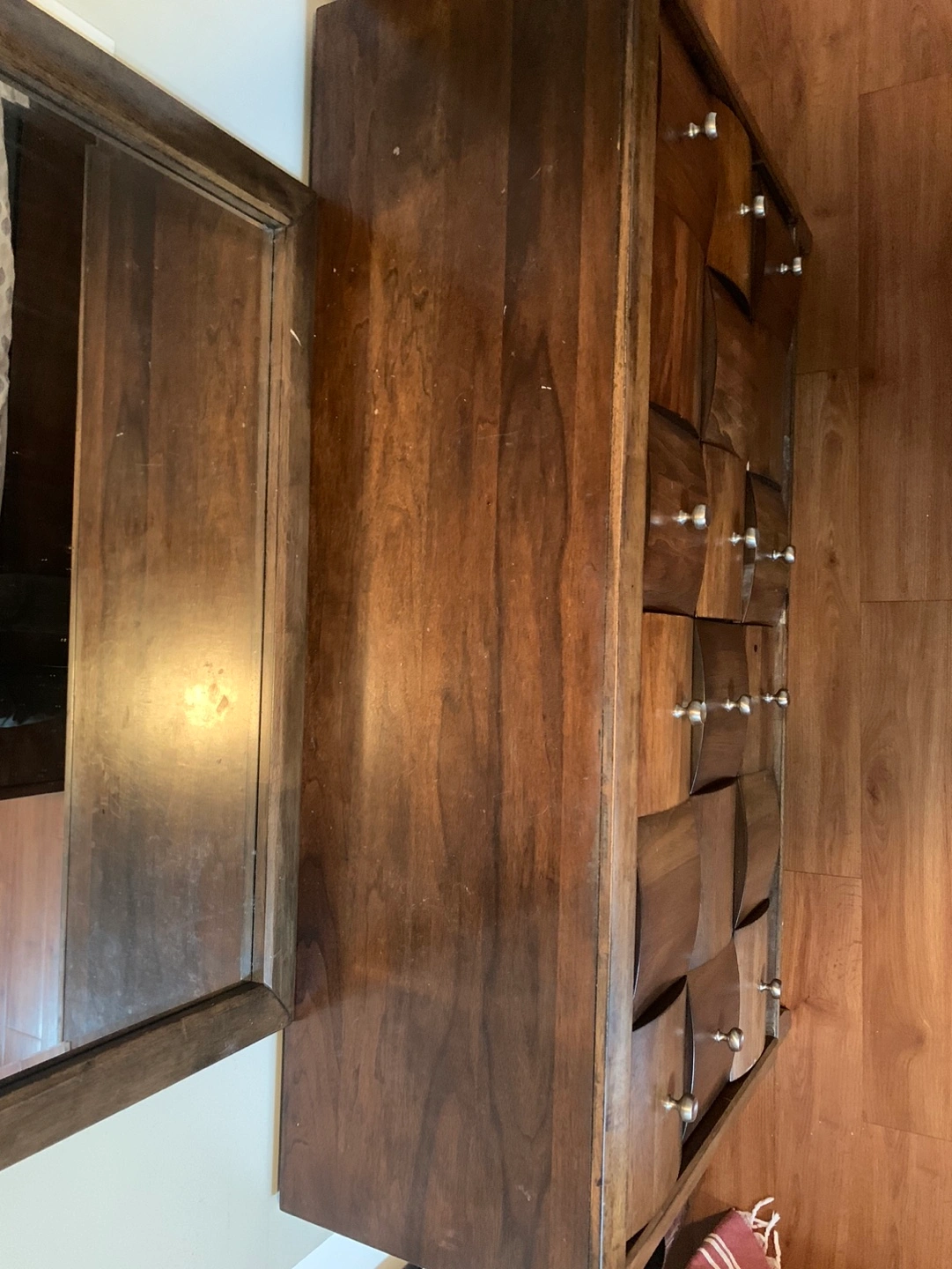 Set includes a large dresser with a mirror and two matching nightstands. Dark wood finish. All pieces are in good condition.