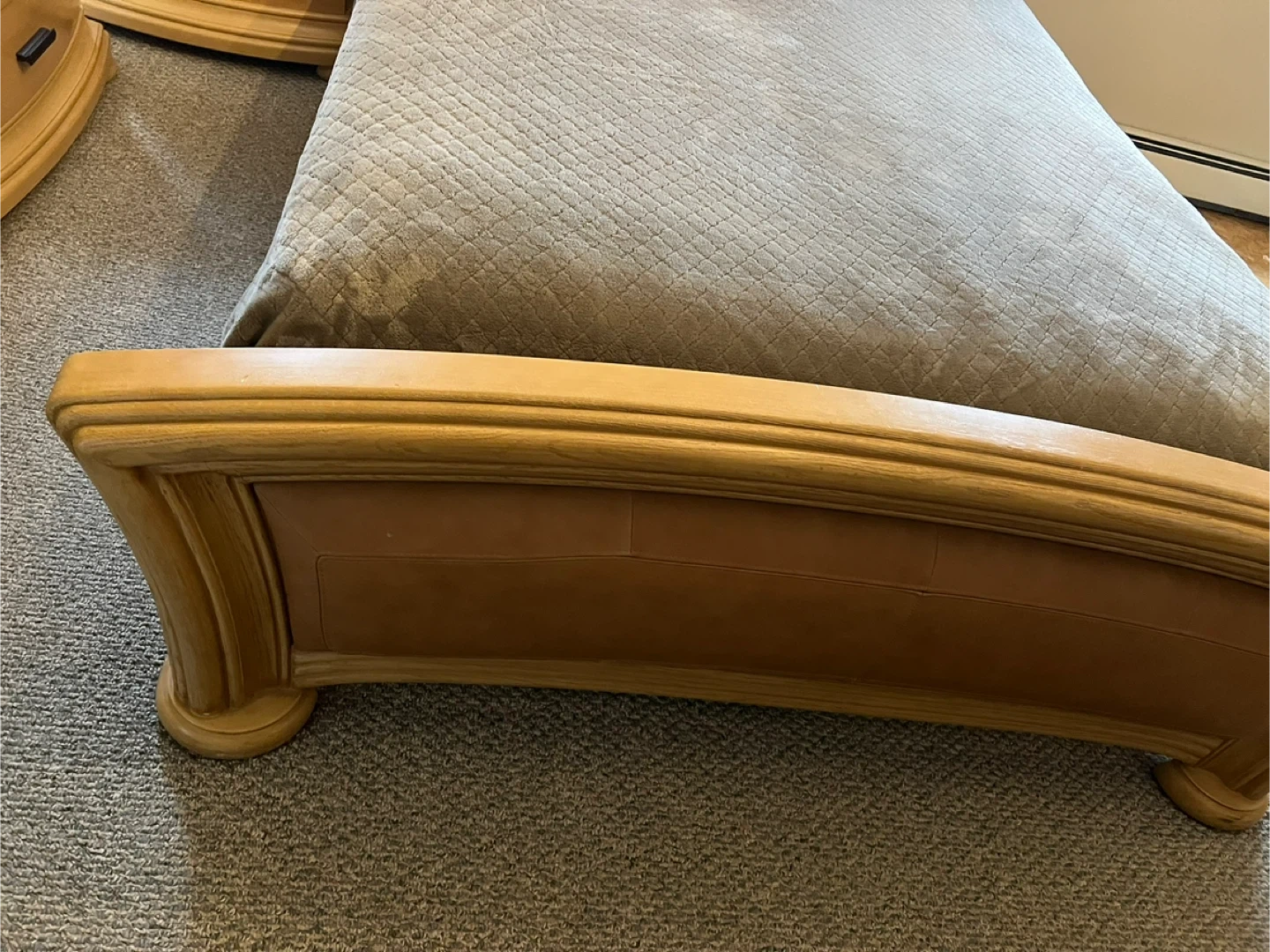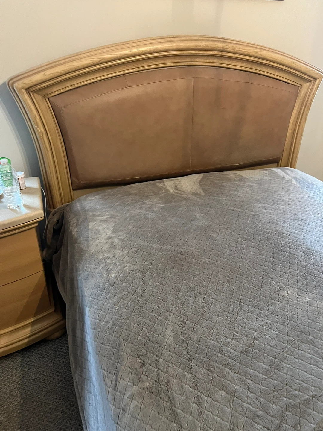 Leather headboard and footboard stone tops on both nightstands and dresser all drawers are deep and in working order.