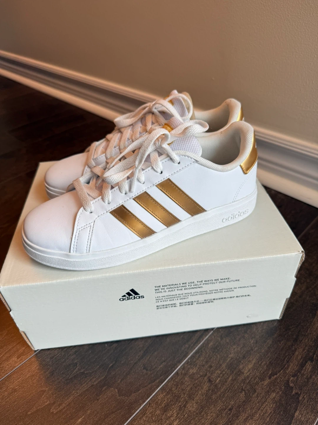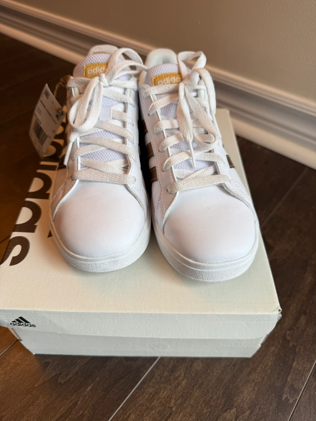 These Adidas Grand Court 2.0 K sneakers are in great condition and come with the original box! They're white with gold stripes, a classic and stylish look. The size is 4.5 in US/Canada sizing. if you fluctuate between a women's size 6, and a women's size 6.5, big kids' size 4.5 will likely be a perfect fit.