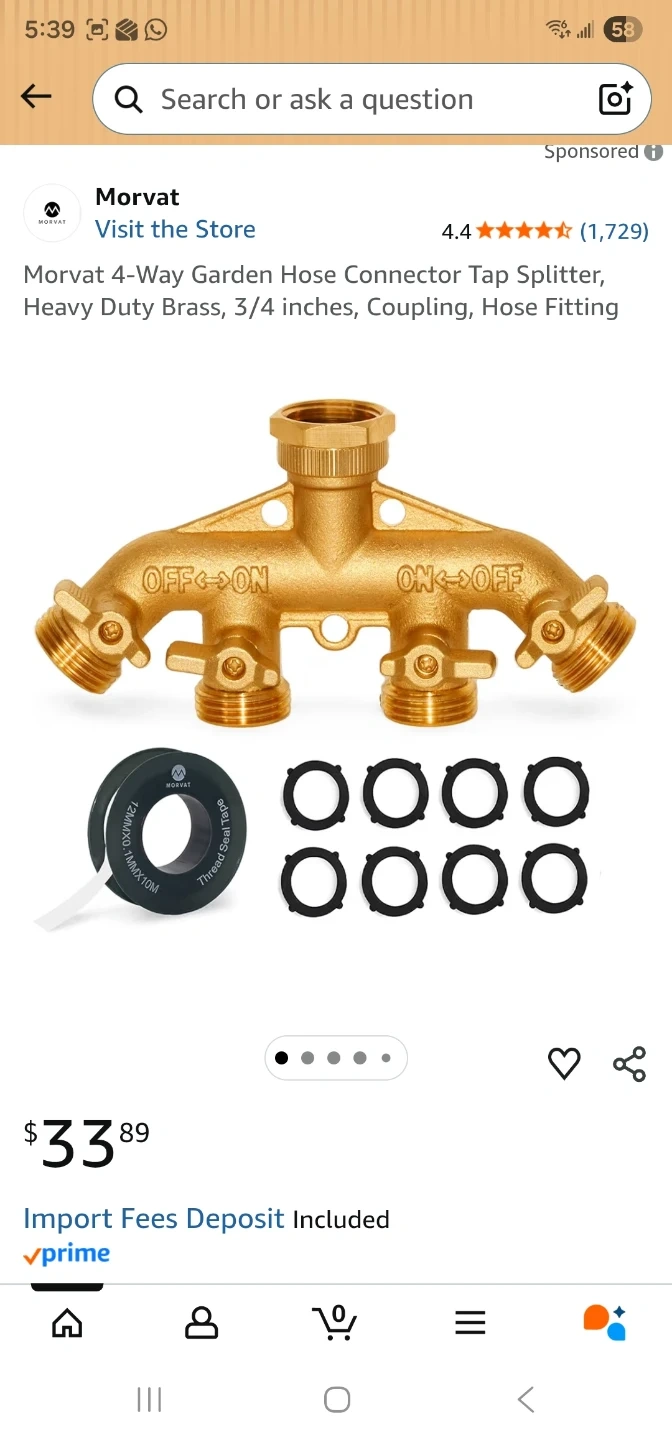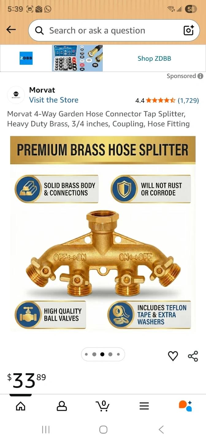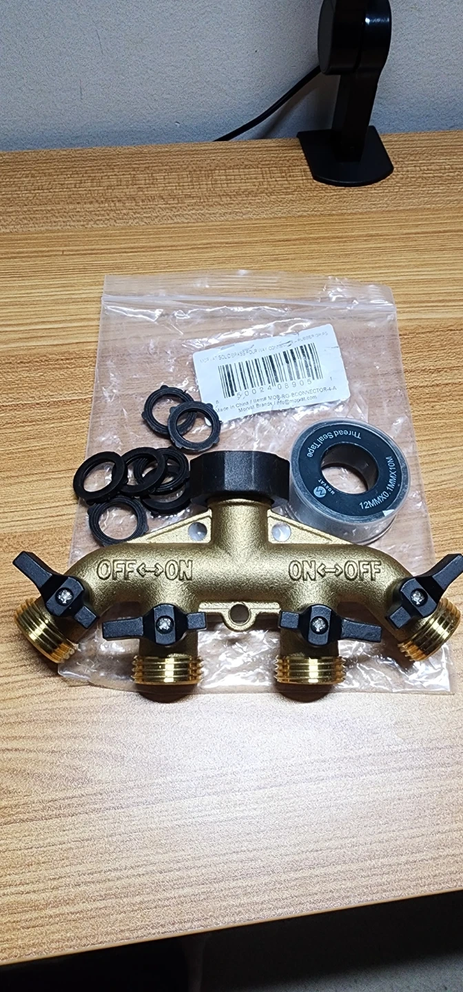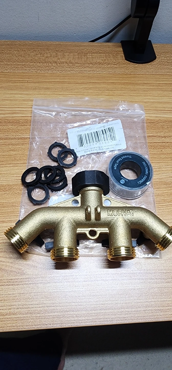 This Morvat 4-way garden hose splitter is made of heavy-duty brass for durability. It features four outlets, each with an independent ON/OFF valve. Includes extra washers and Teflon tape for a secure connection.