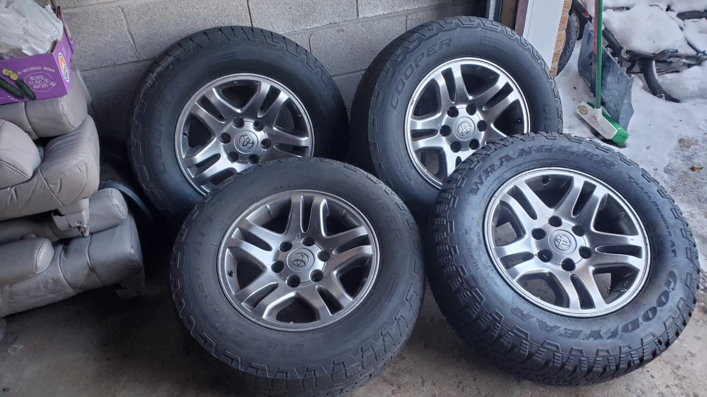 Four Goodyear Wrangler All-Terrain tires, size 265/65R17. These tires are suitable for various terrains and driving conditions. Frim price for Toyota
