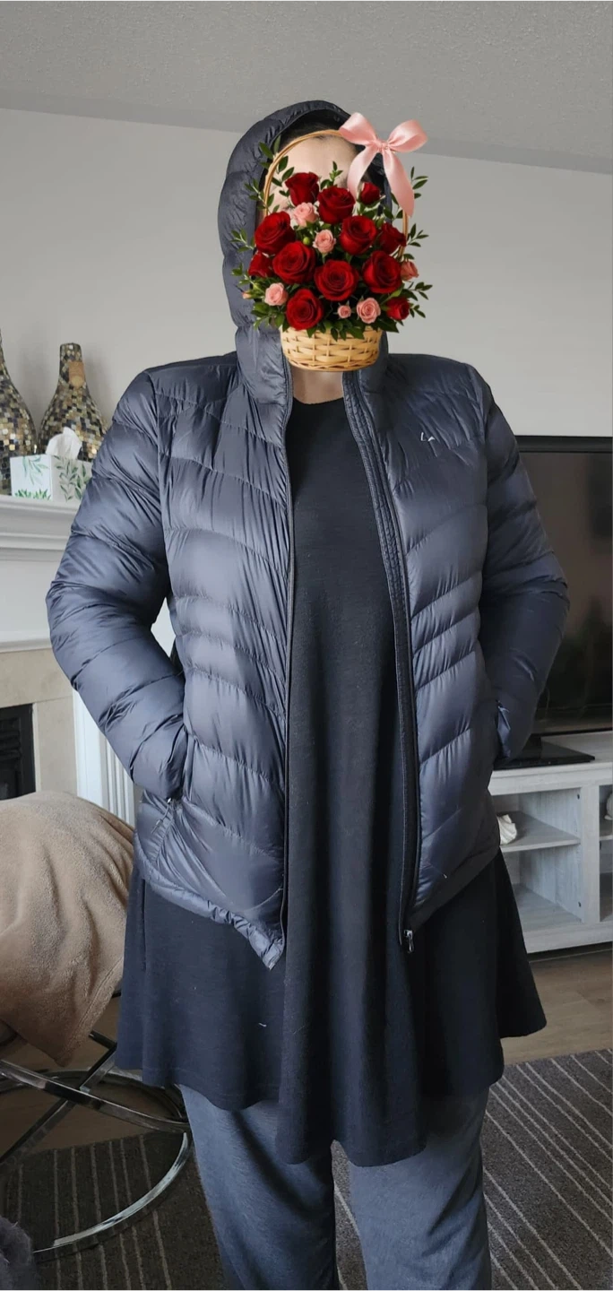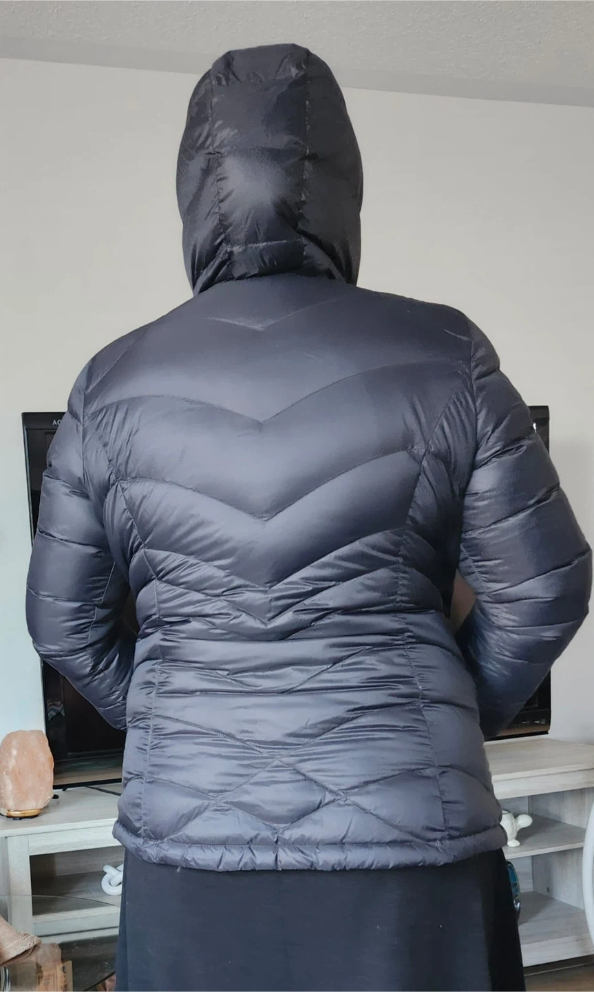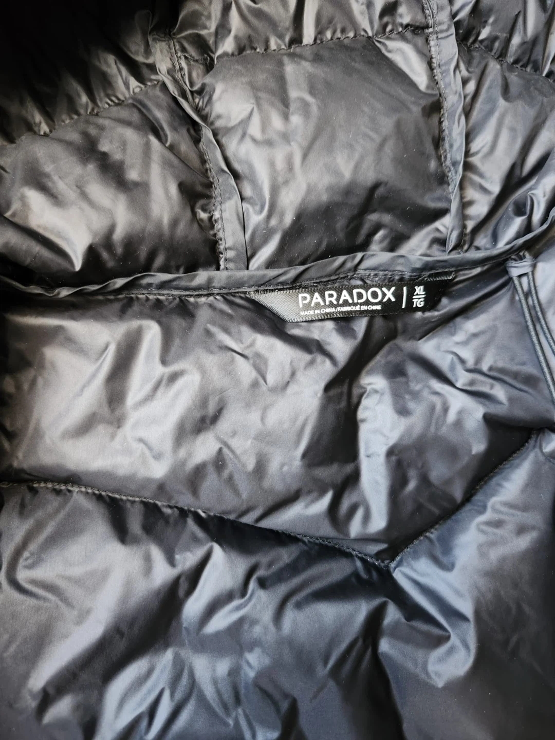 This Paradox puffer jacket is dark grey and features a hood. It's a size XL. It's a great jacket for staying warm.
