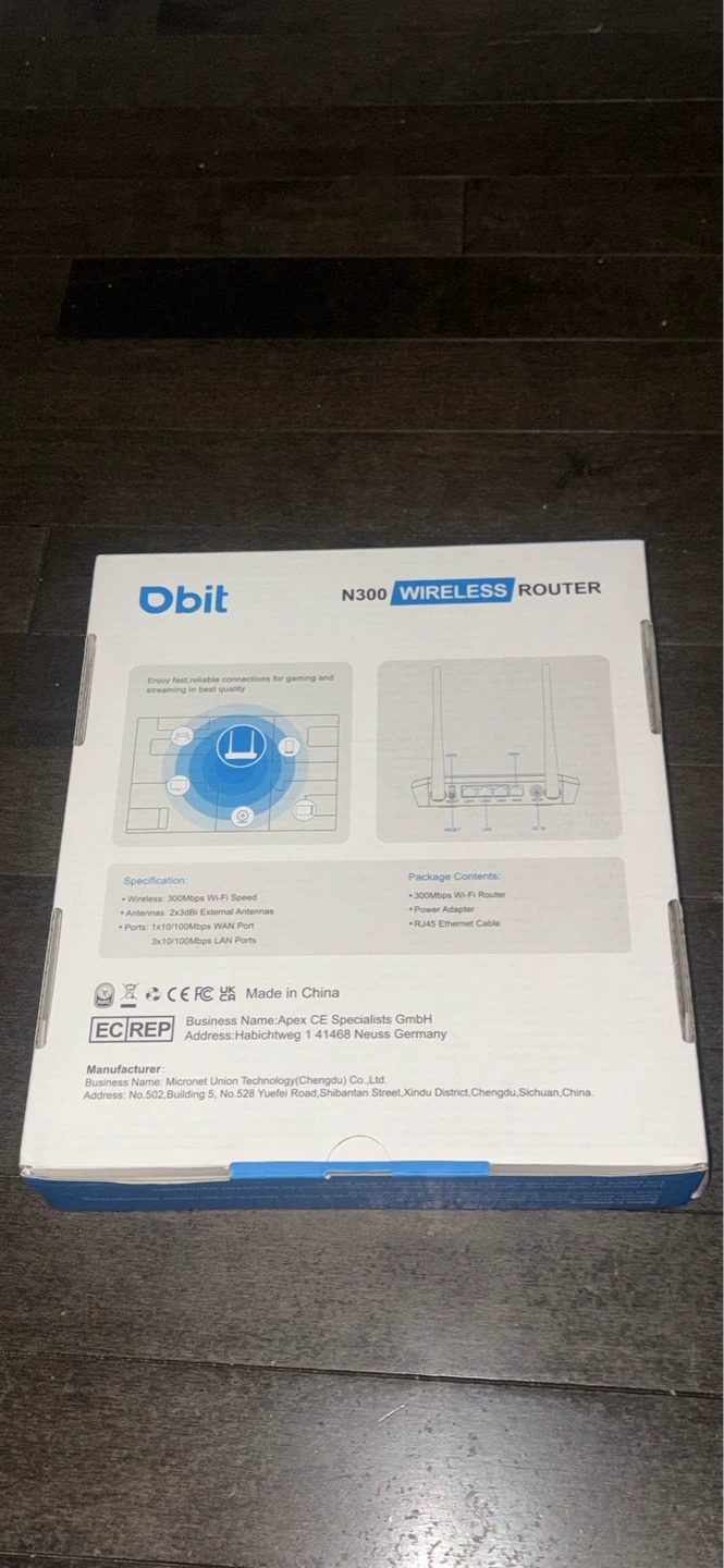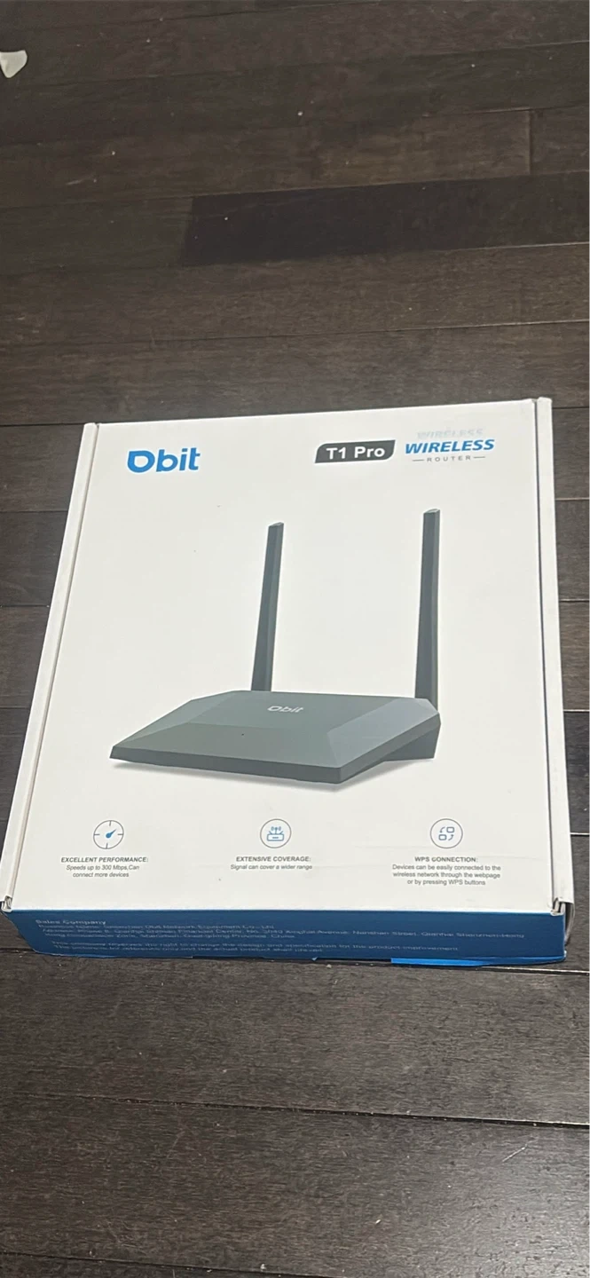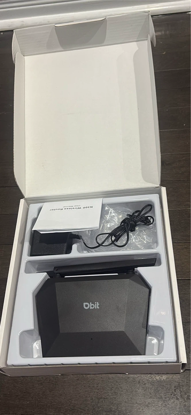 Dbit N300 Wireless Router T1 Pro. Features 300Mbps Wi-Fi Speed with dual external antennas. Includes router and power adapter. Ready for reliable internet connections.