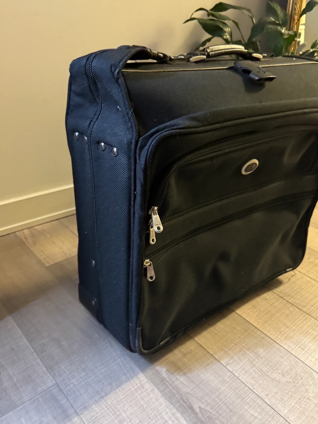This American Tourister is a black rolling suitcase with a telescopic handle and multiple zippered compartments.