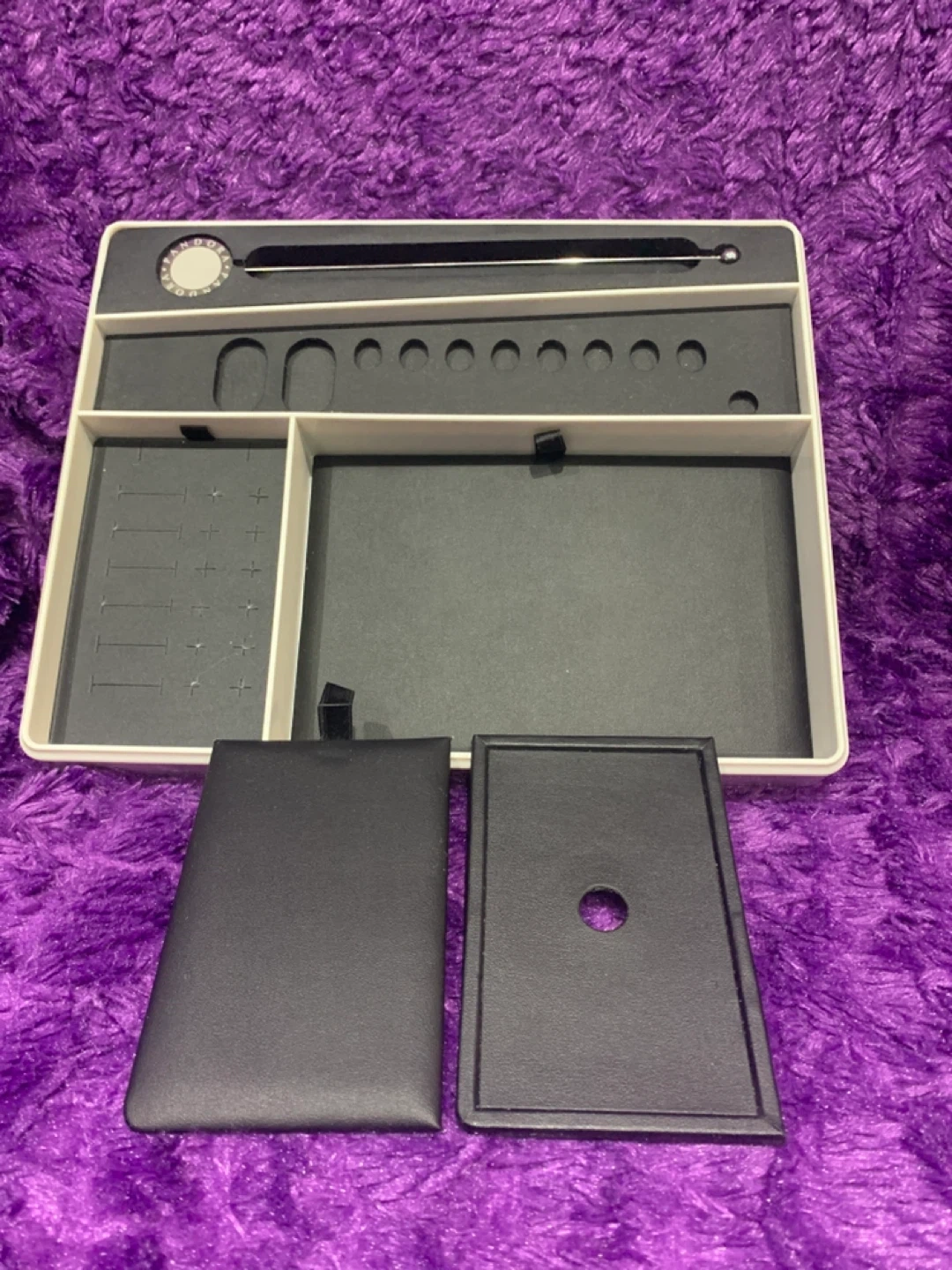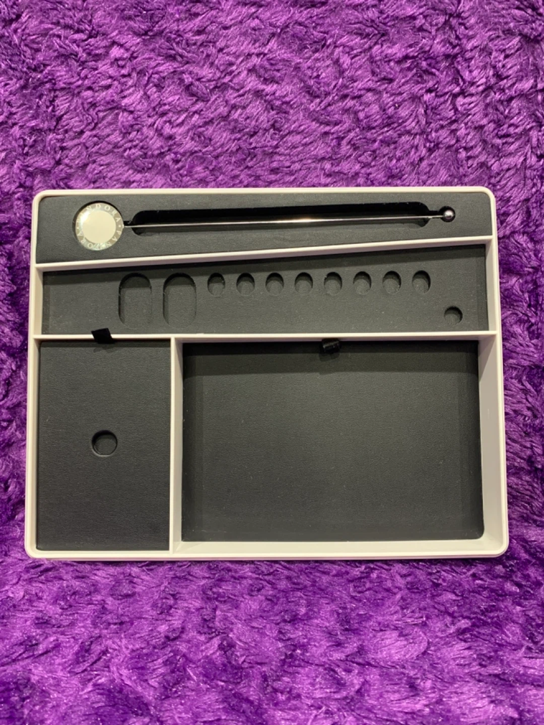 This is a Pandora jewellery display tray. It's designed with multiple compartments to hold rings, bracelets, and other small accessories. It's perfect for keeping your Pandora collection neatly organized.