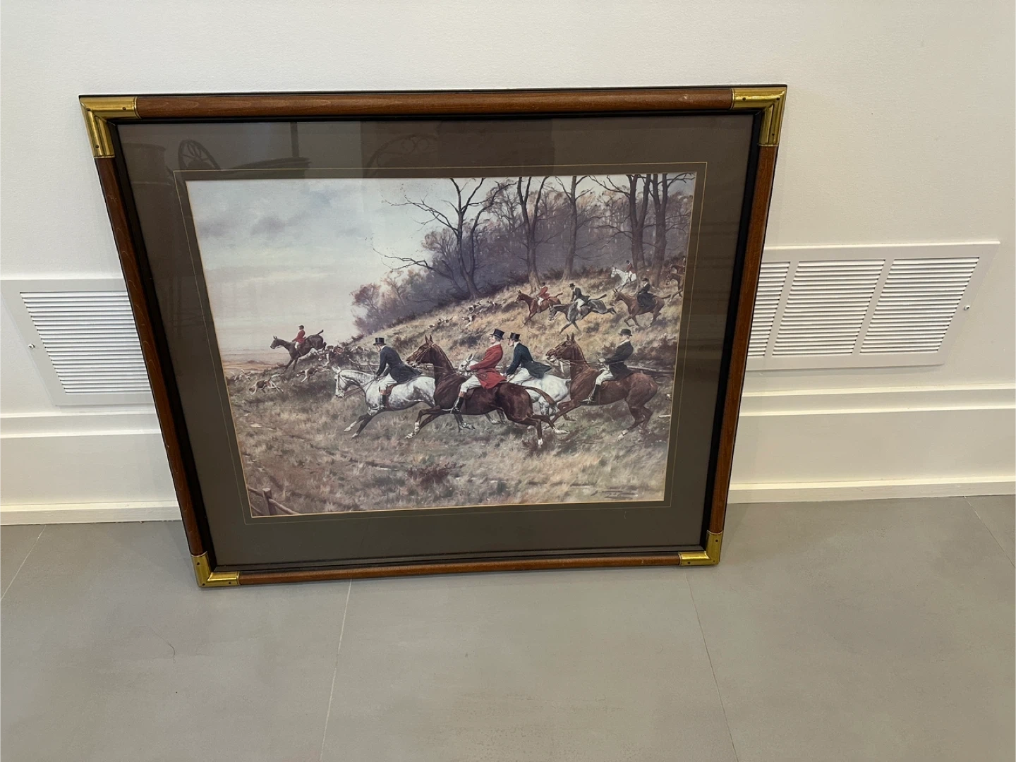 This framed print depicts a classic fox hunt scene with riders on horseback. It's enclosed in a wooden frame with brass corner accents. Ready to hang, this piece adds a touch of traditional art to any room. It would be a nice addition to a study or living area.