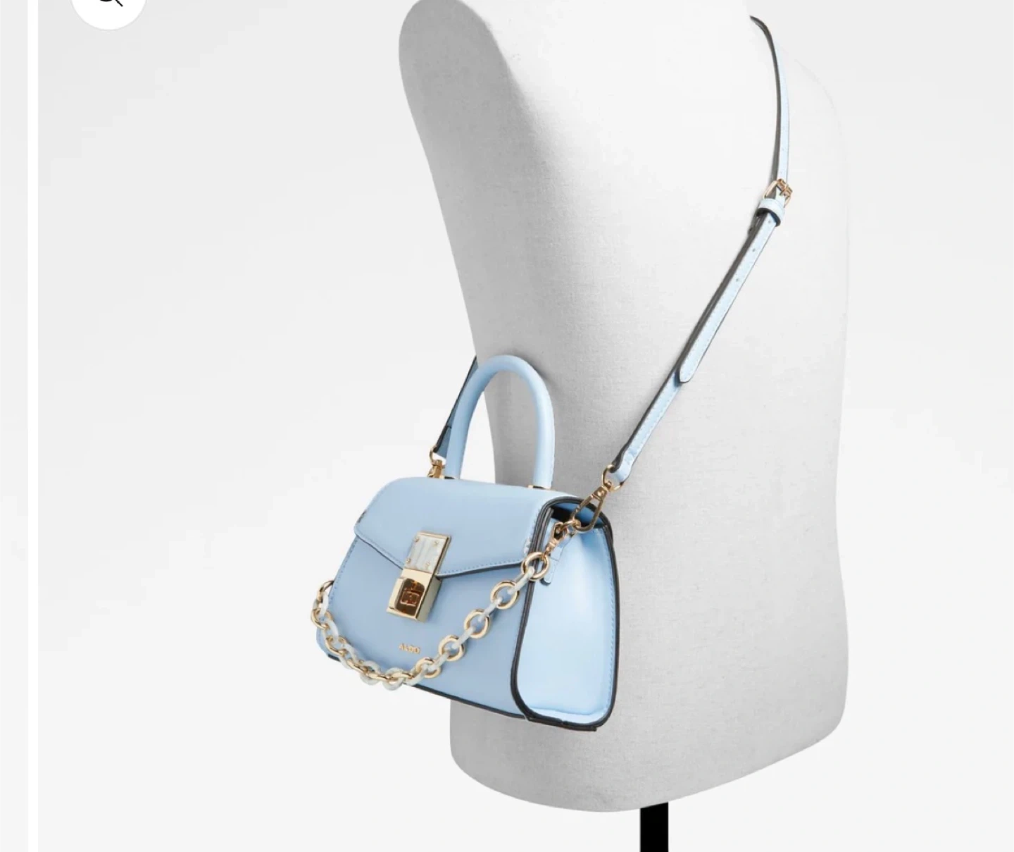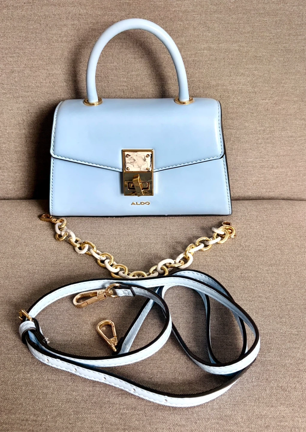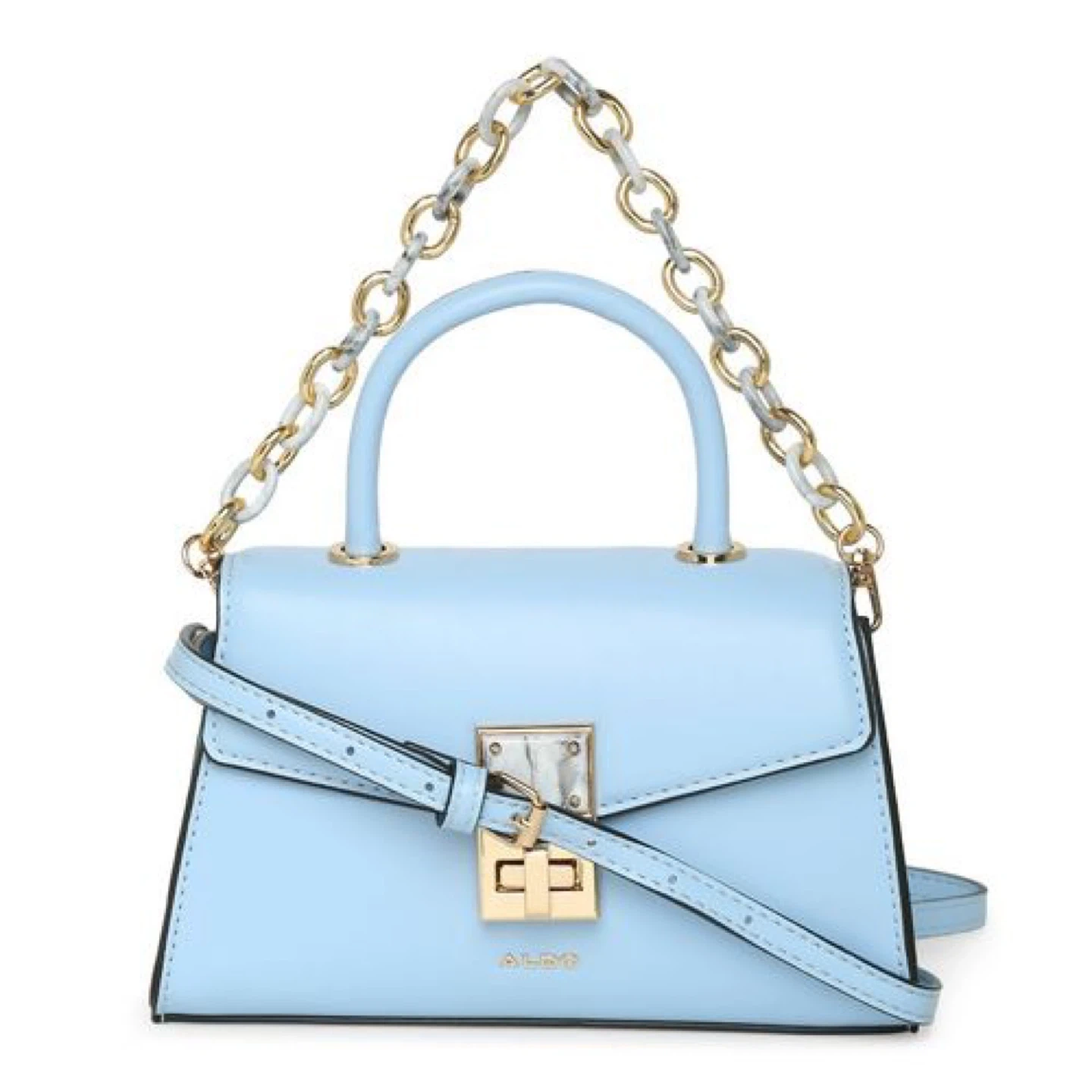 This is a stylish light blue top handle purse from ALDO. It comes with a decorative gold chain strap and a detachable crossbody strap. The purse features a secure clasp closure and a chic, compact design.