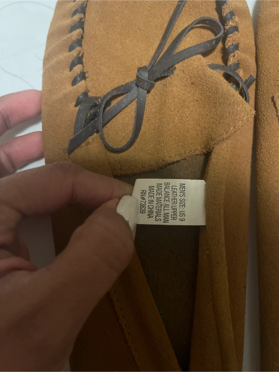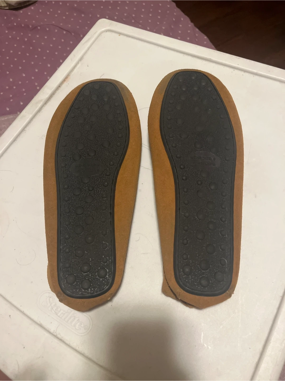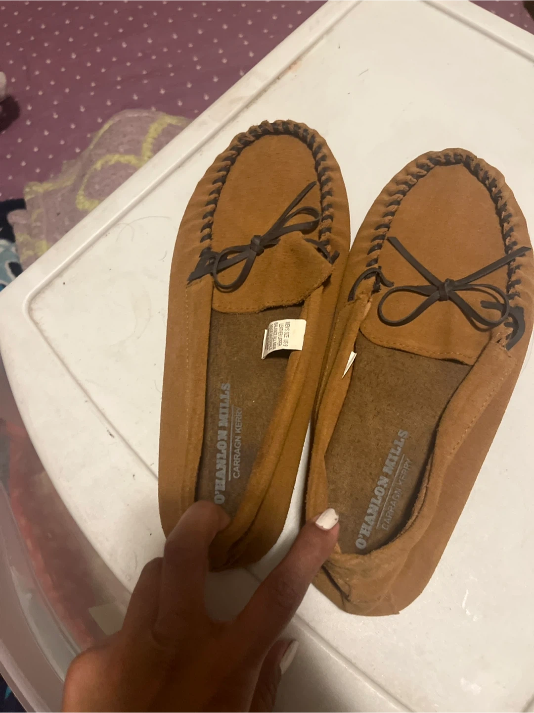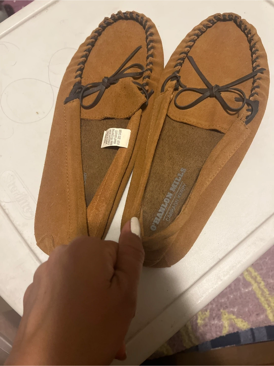 Selling a pair of O'Hanlon Mills moccasin slippers in men's size 9! These are a comfy tan color and have a leather upper with man-made materials. They're perfect for wearing around the house! Never worn! Pick ups only.