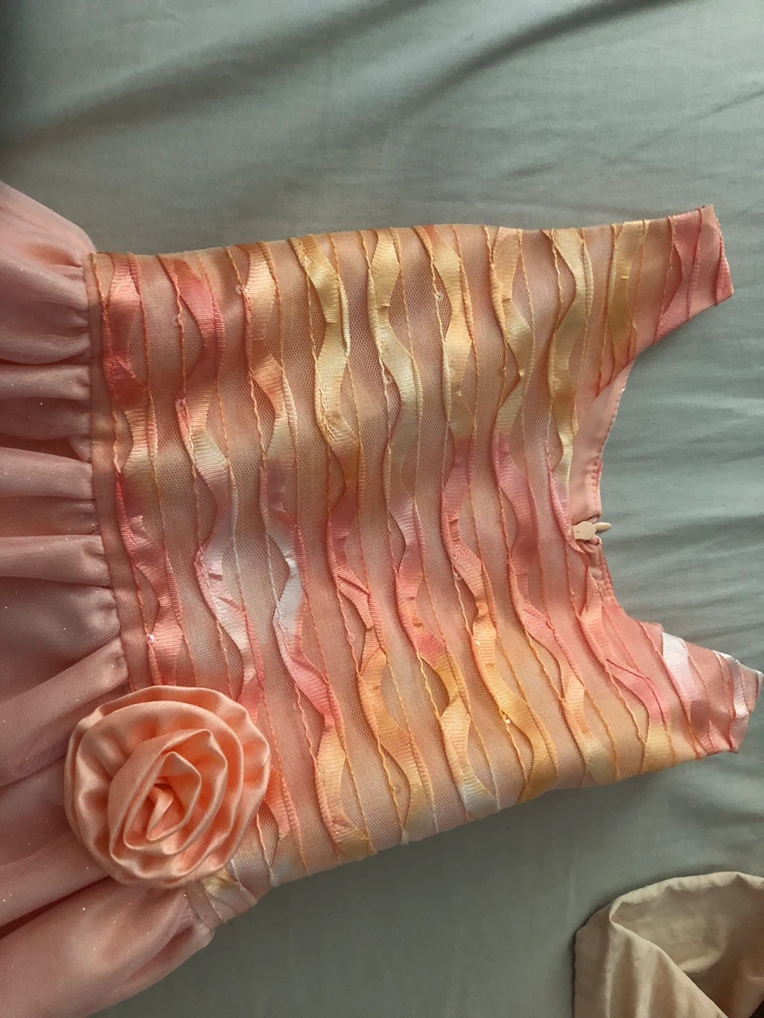 This pretty dress features a pink and orange wavy ribbon accent on the bodice with a delicate rose applique on the side. The skirt is a shimmering tulle, perfect for special occasions. It has a zipper closure on the back.