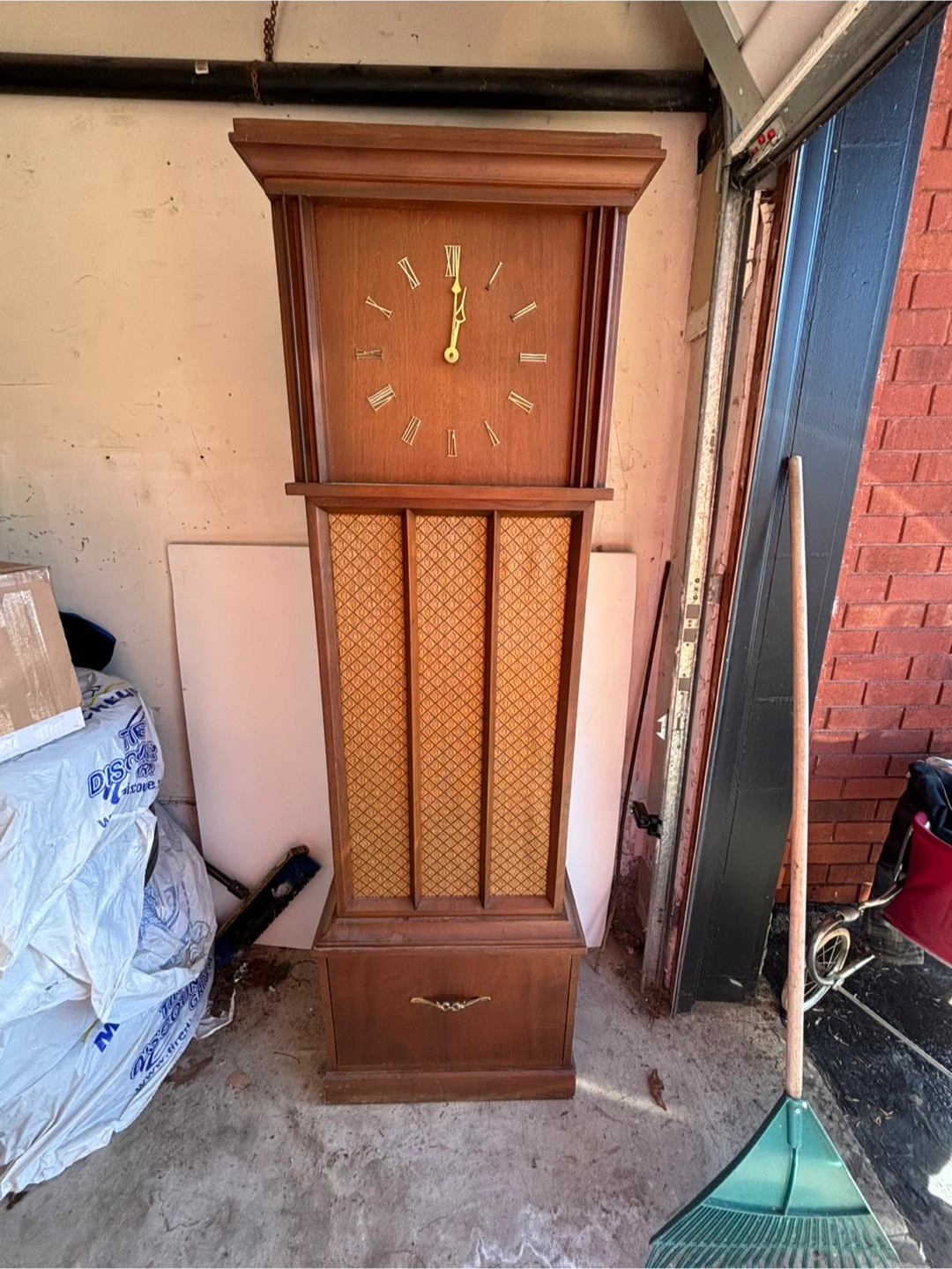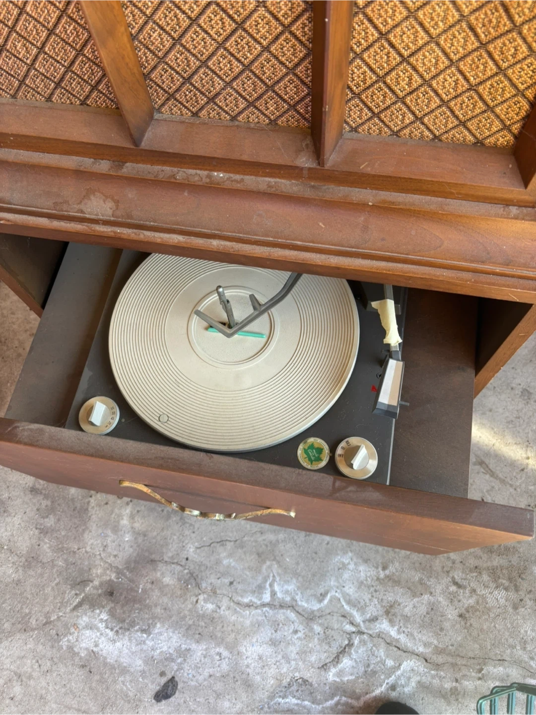 This vintage console features a working record player and a clock. It's housed in a beautiful wooden cabinet with a decorative speaker grille. Plays records and tells time!
