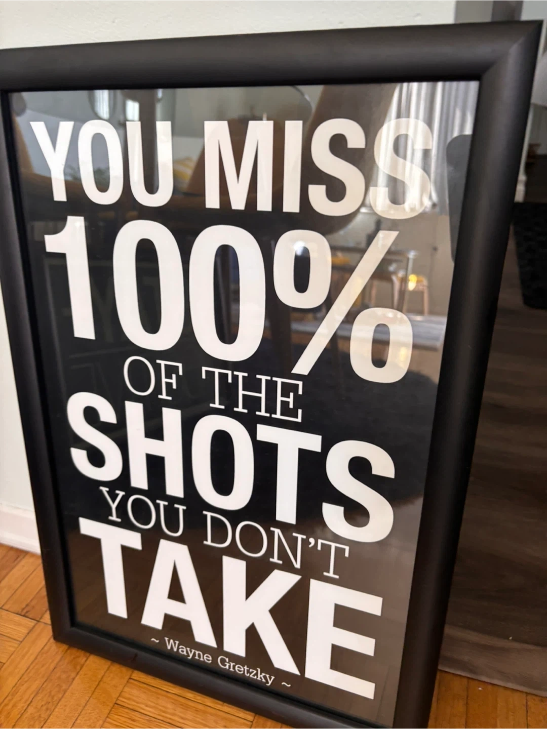 Framed print featuring the inspirational quote "You Miss 100% of the Shots You Don't Take" attributed to Wayne Gretzky. It's housed in a sleek black frame. This piece is great for any sports enthusiast's home or office.