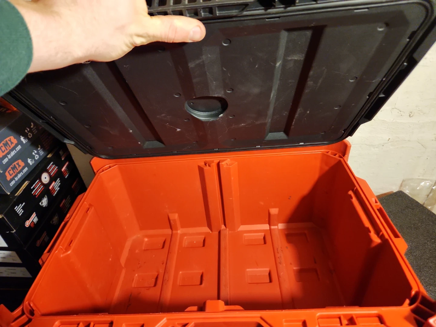 Red and black modular stacking tool box. Water resistant IP 68. Barely used and that's why i'm selling it. Capable of being locked. 120 firm text 4379905288 if no reply here.
