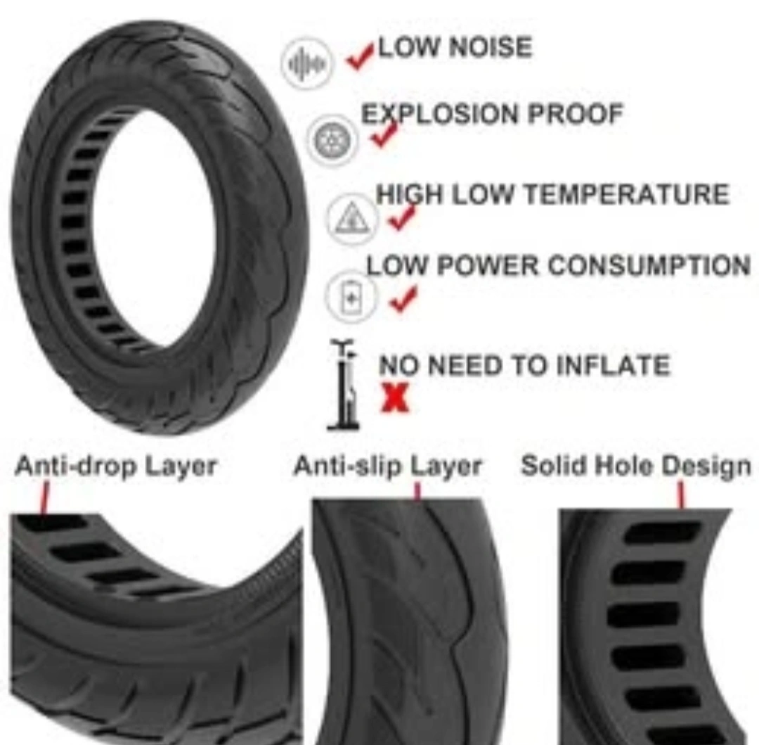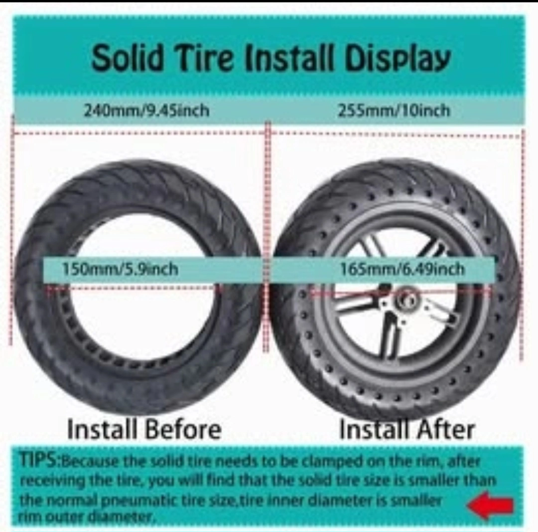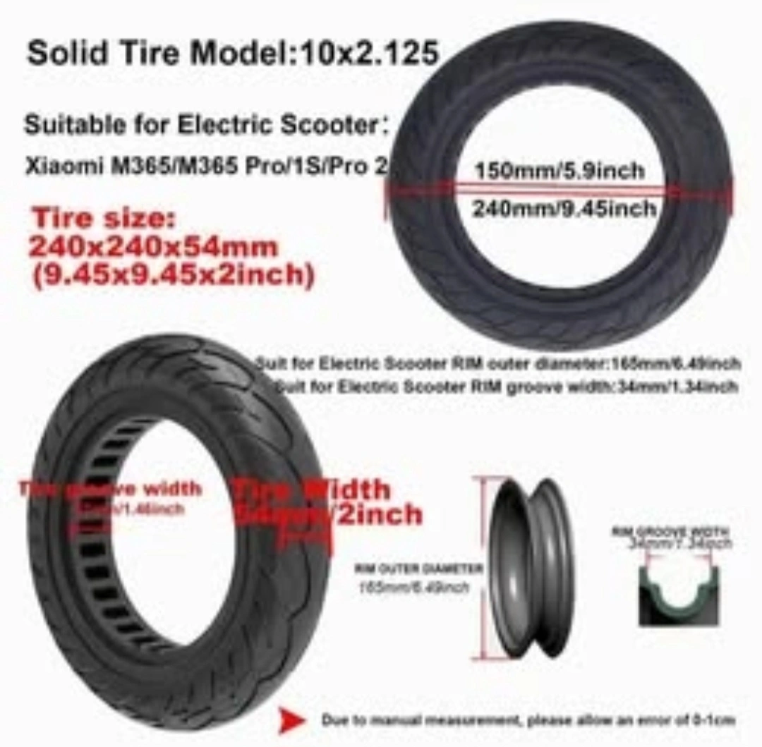 Solid tire for electric scooter. Size: 10x2.125. 240x240x54mm (9.45x9.45x2inch). Low noise, explosion proof, high/low temperature resistant, low power consumption. No inflation needed. Anti-drop and anti-slip layers.