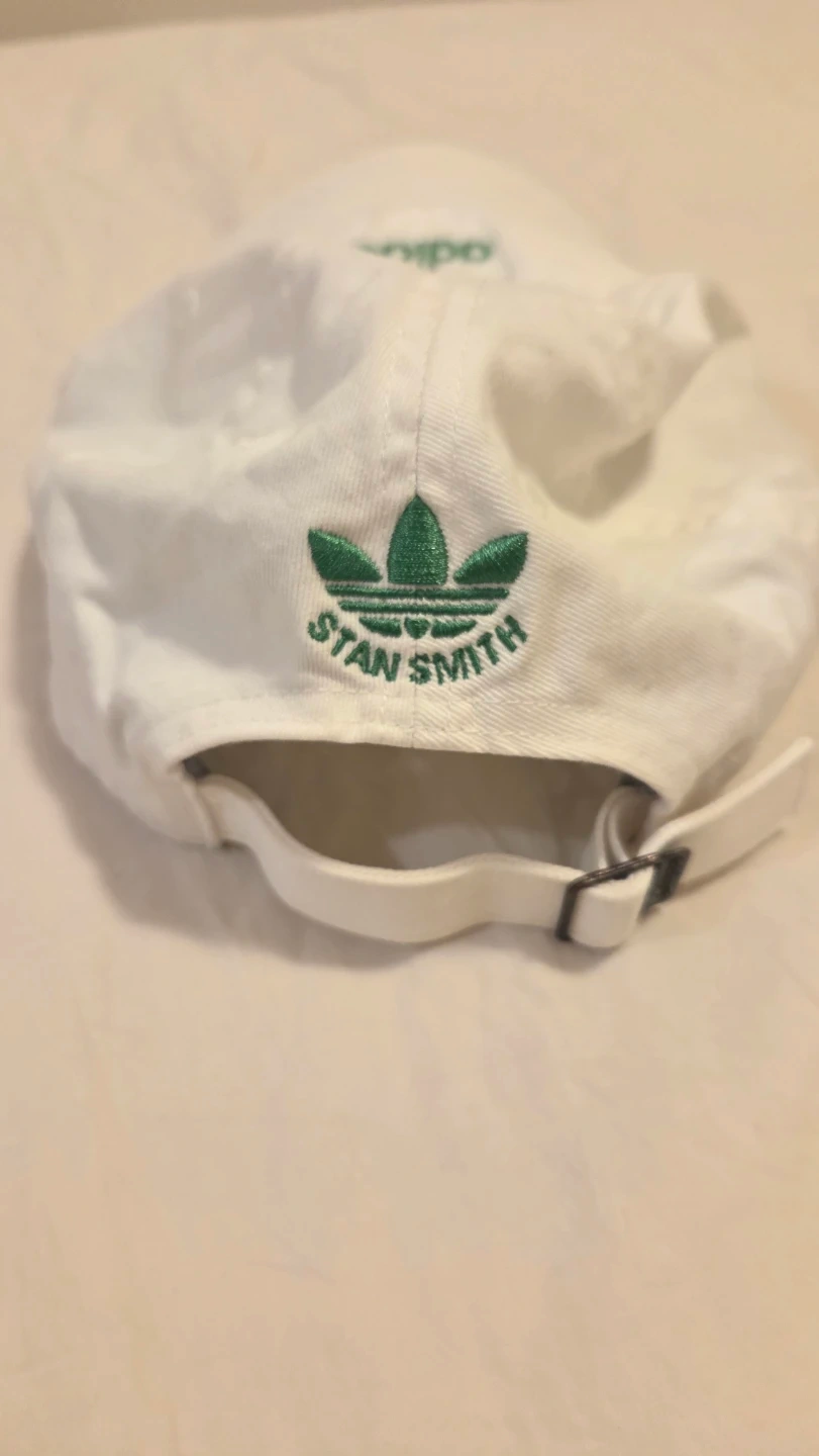 White Adidas cap hat with green Stan Smith branding and adjustable strap. Size is One Size Fits All.