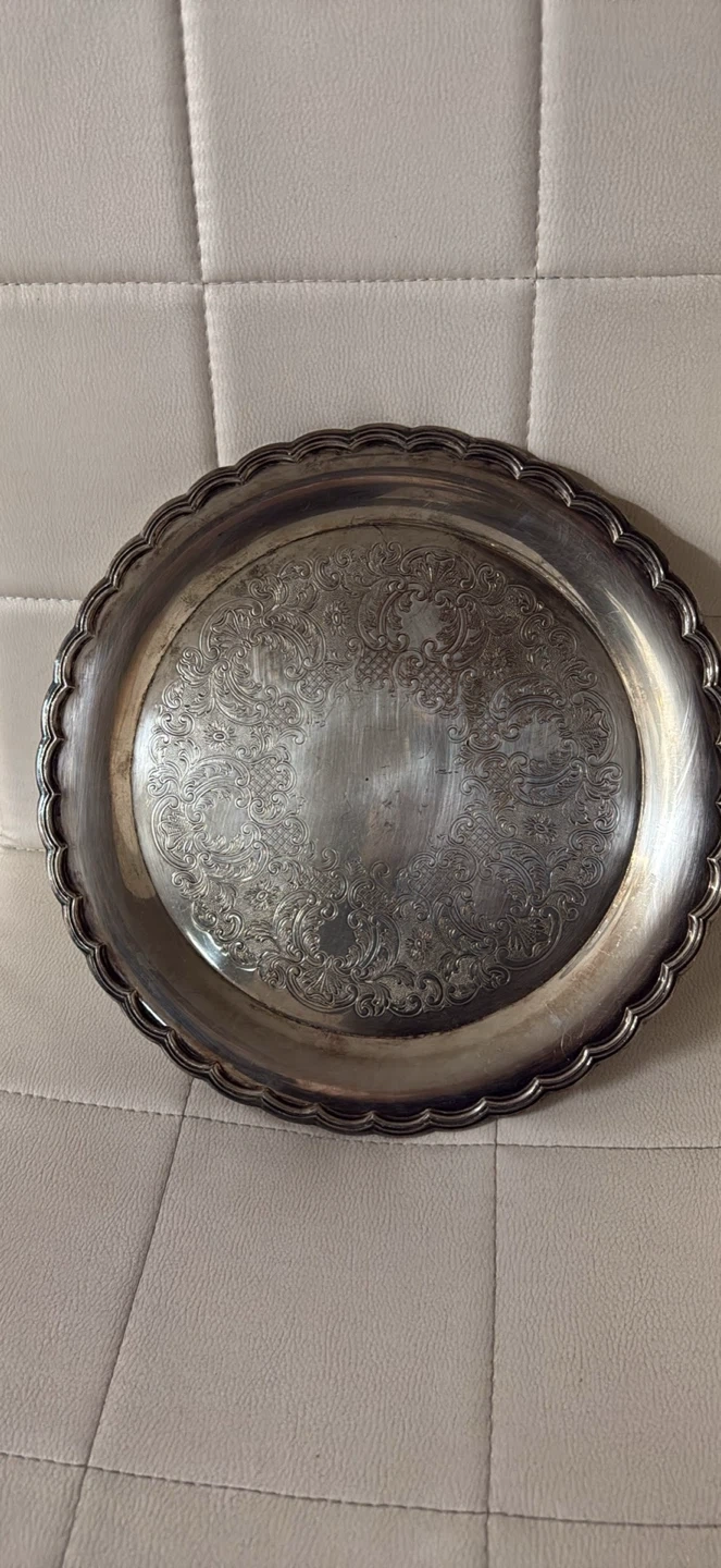 A decorative serving tray with an ornate etched design. It's made of metal with a silver-tone finish and a scalloped edge. This tray is suitable for serving appetizers or as a decorative piece.