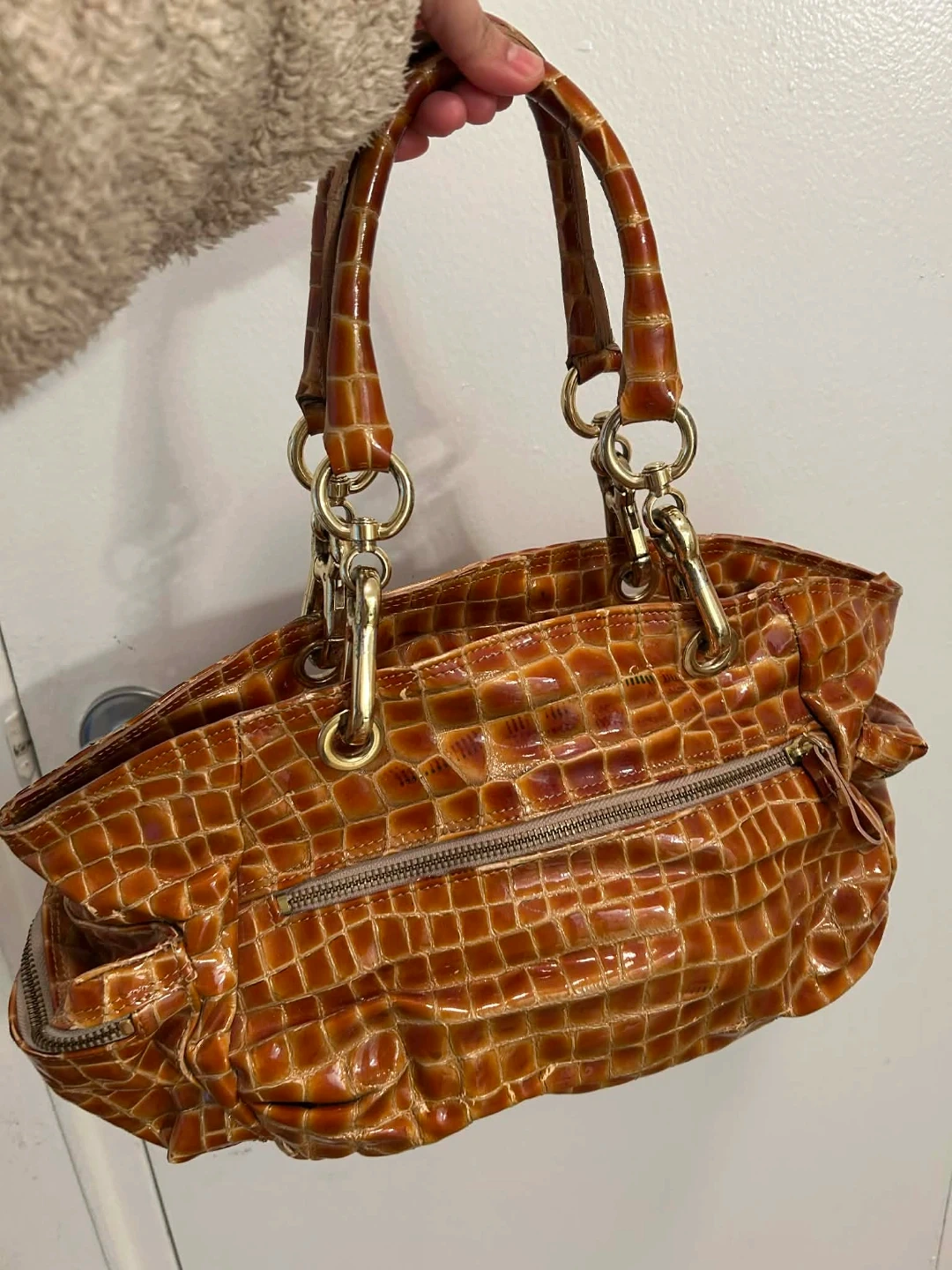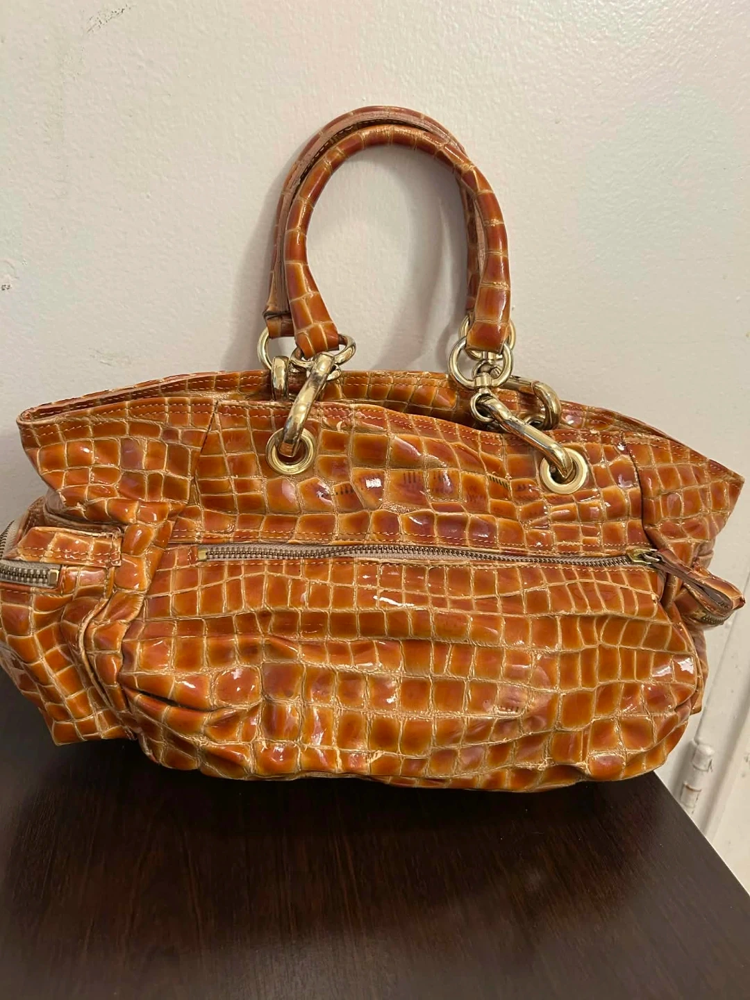 Stylish brown handbag with a faux crocodile texture. It features a zippered main compartment and gold-tone hardware. This versatile bag is perfect for everyday use or a night out!