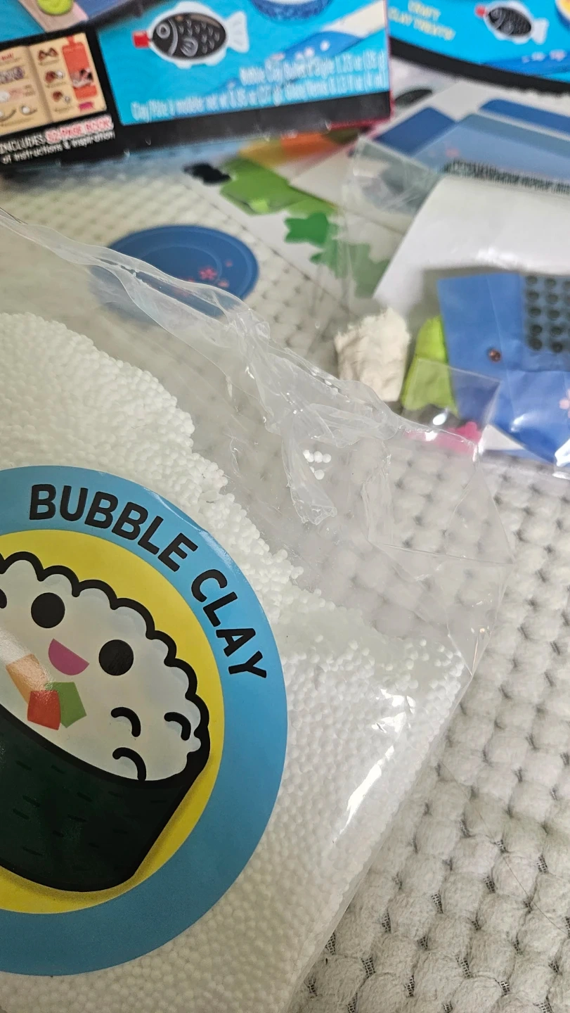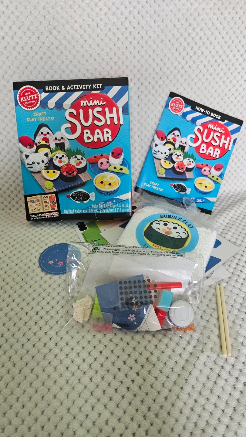 This is the Klutz Mini Sushi Bar Craft Book & Activity Kit. It includes everything you need to make pretend sushi with bubble clay and other craft supplies. It also comes with a how-to book for instructions and inspiration. Fun for kids who love to craft!