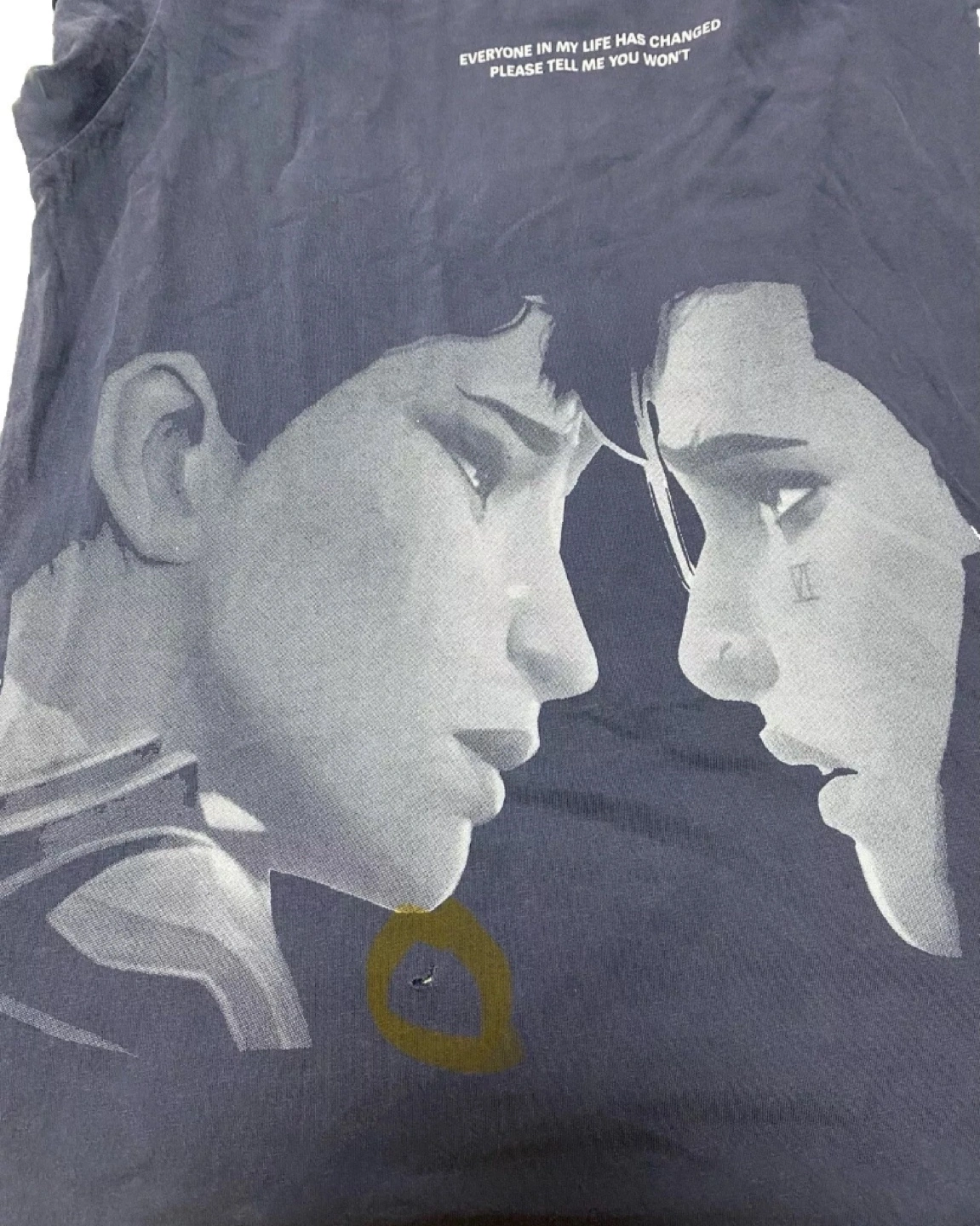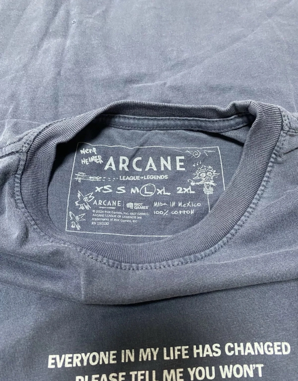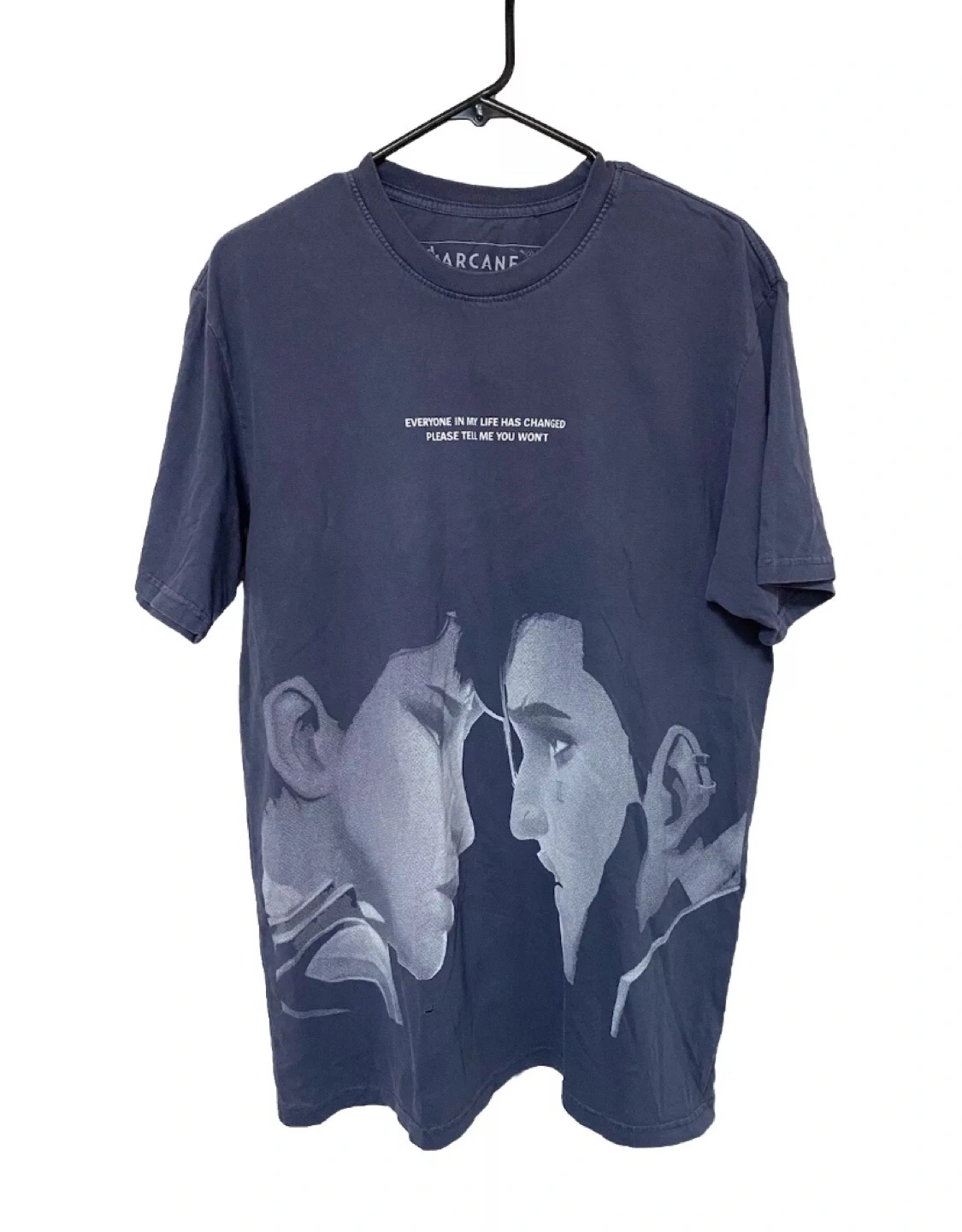 Blue t-shirt featuring an image of two characters from the show Arcane. It reads 'Everyone in my life has changed, please tell me you won't'.