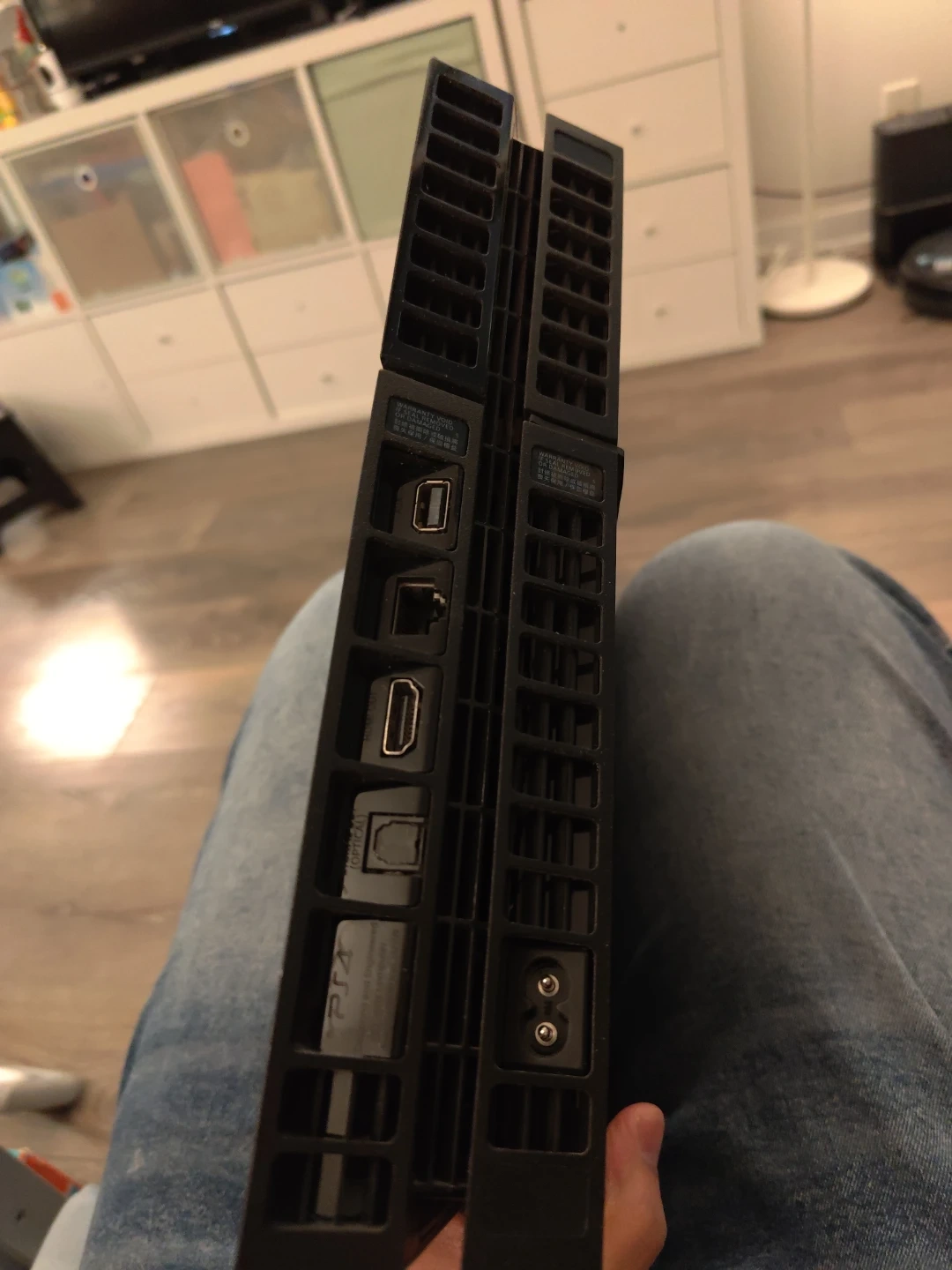 Hong Kong Version. Only console. And power chors. I cam give 1 HDMI and 1 controller. This is a black Sony PlayStation 4 Slim console. It features ports for HDMI, USB, and Ethernet. Ready for gaming adventures!