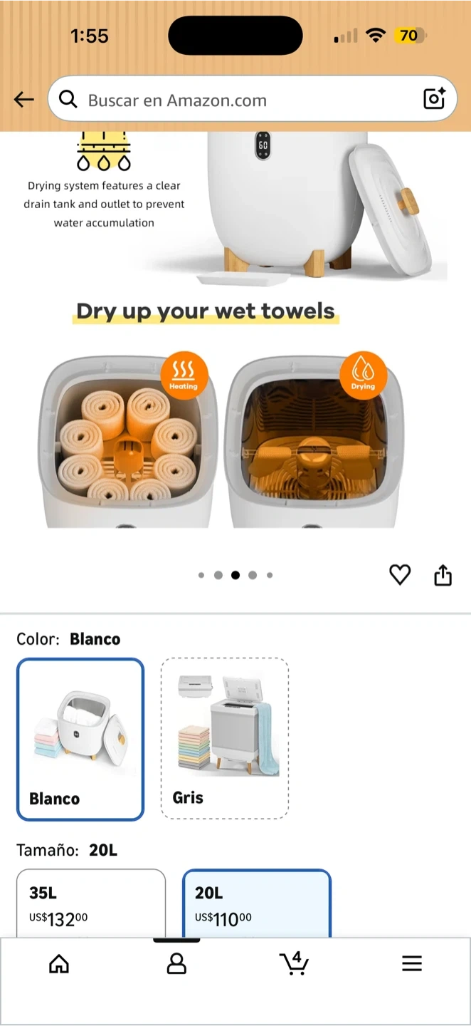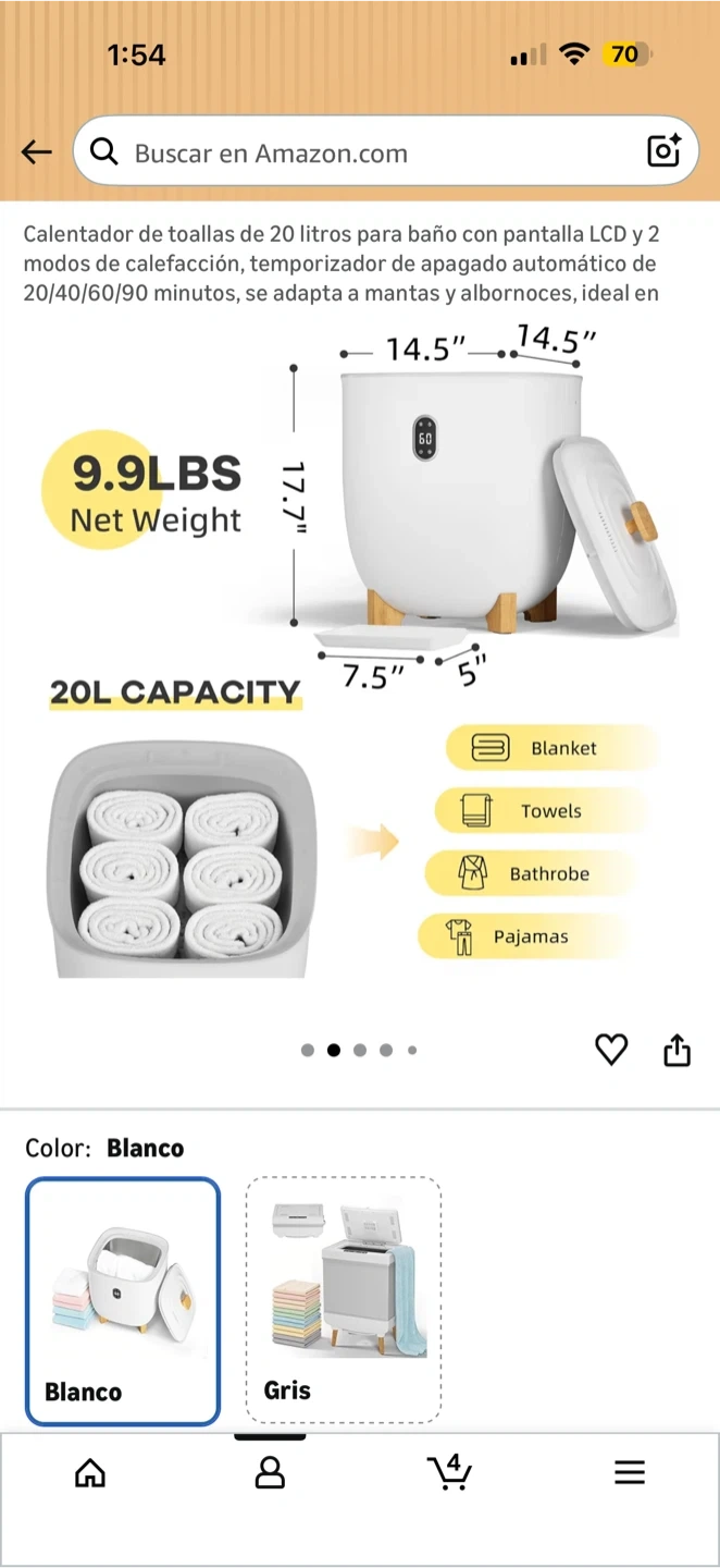 This bathroom towel warmer features a 20L capacity and an LCD display with automatic shut-off timers for 20, 40, 60, or 90 minutes. It's ideal for warming towels, blankets, bathrobes, or pajamas. The unit has a net weight of 9.9 lbs and dimensions of 14.5" x 17.7" x 7.5".
