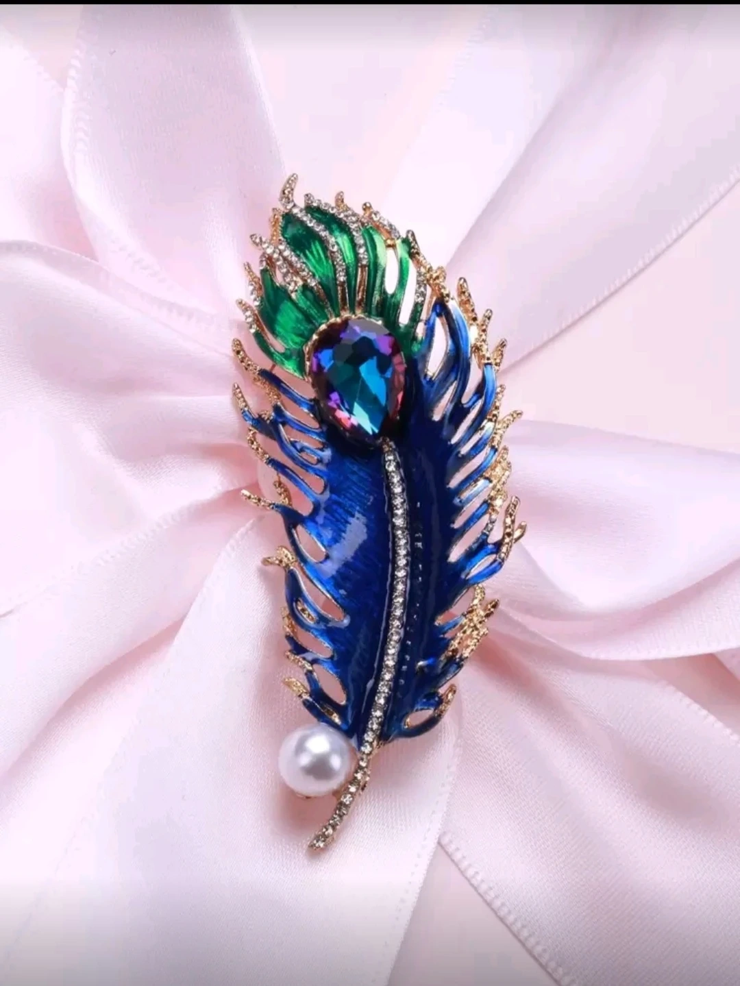 This beautiful brooch is designed to look like a peacock feather. It features colourful enamel, sparkling rhinestones, and a faux pearl accent. It's a lovely accessory to adorn clothing or a scarf!