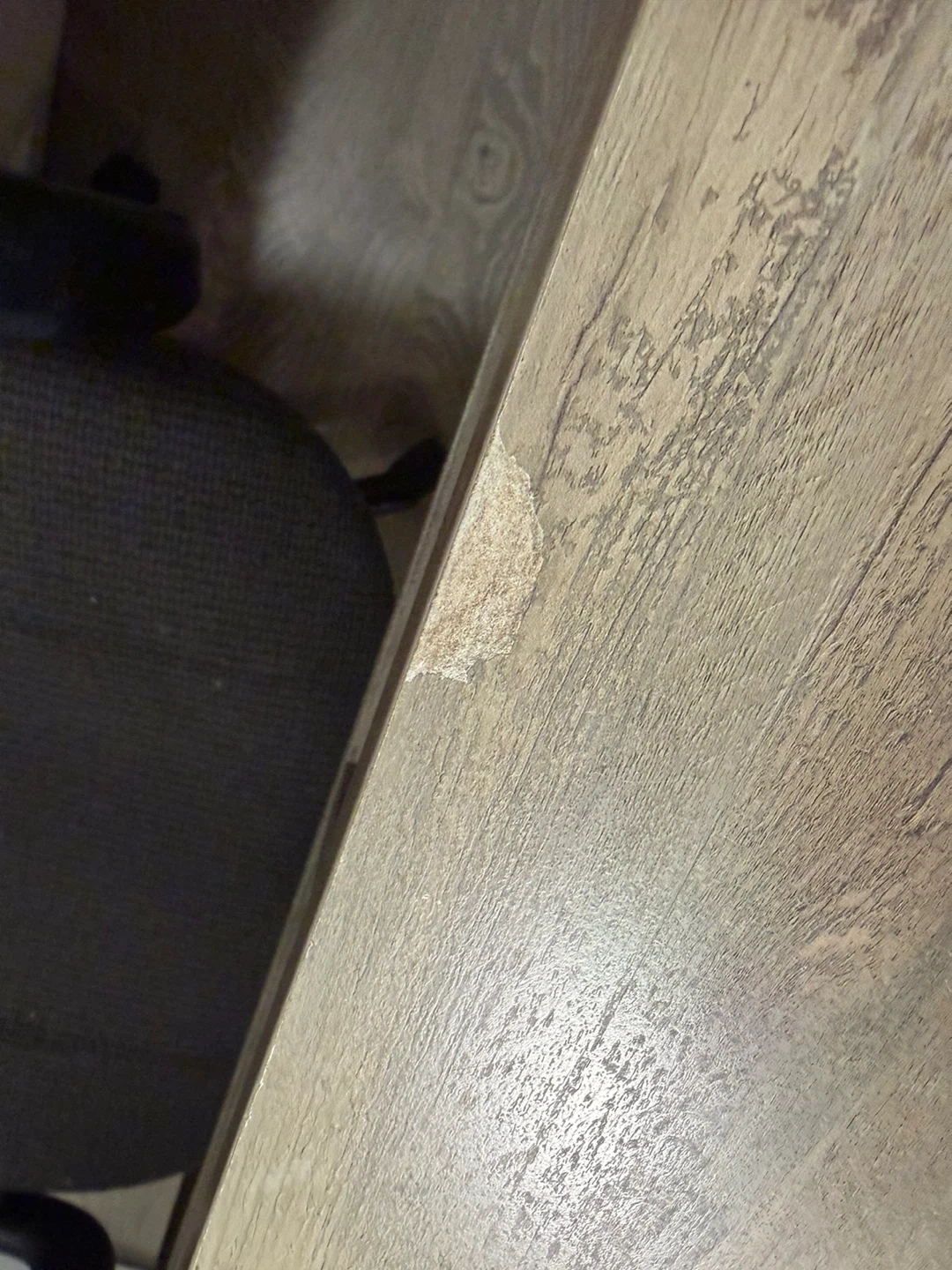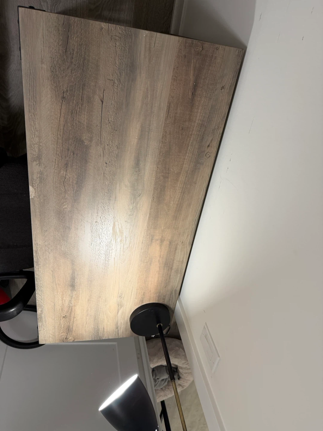 This desk has a wood grain finish and black metal legs, offering a simple workspace. It's compact and includes a shelf underneath for storage. There's a small chip on the edge of the desk.