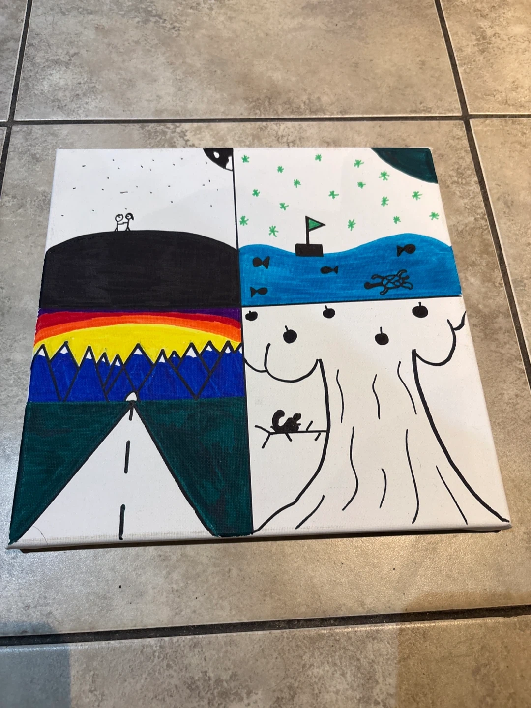 This is a four-panel canvas painting with unique artwork on each section. It features diverse scenes including a landscape with two figures, a boat on water, a mountain road, and a tree with a squirrel. Acrylic paint on canvas.