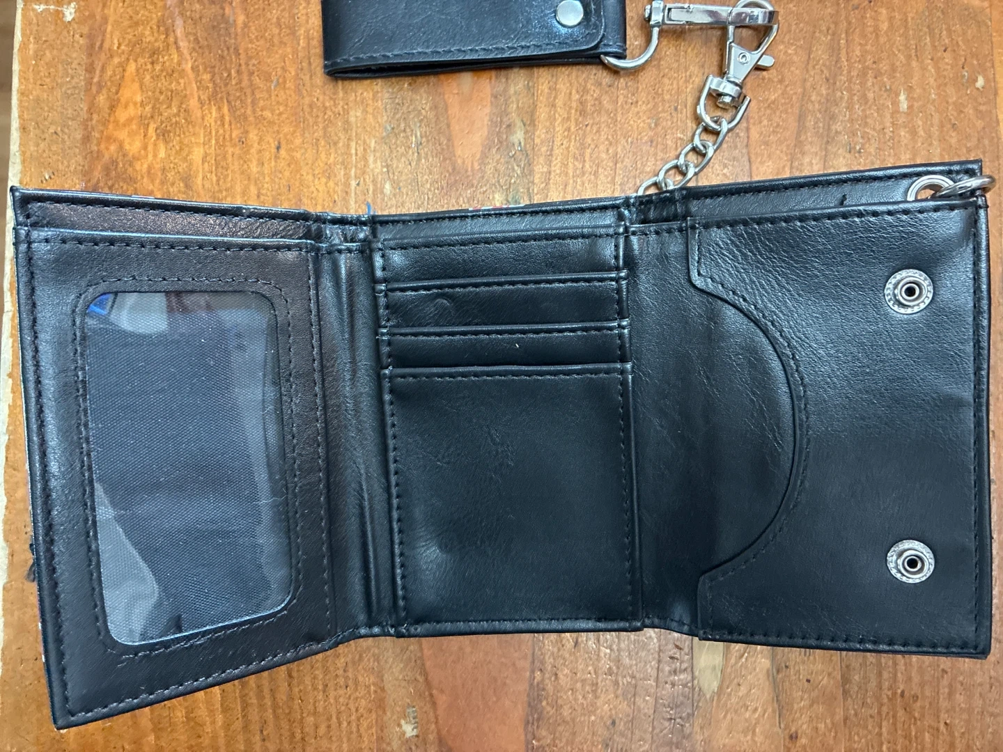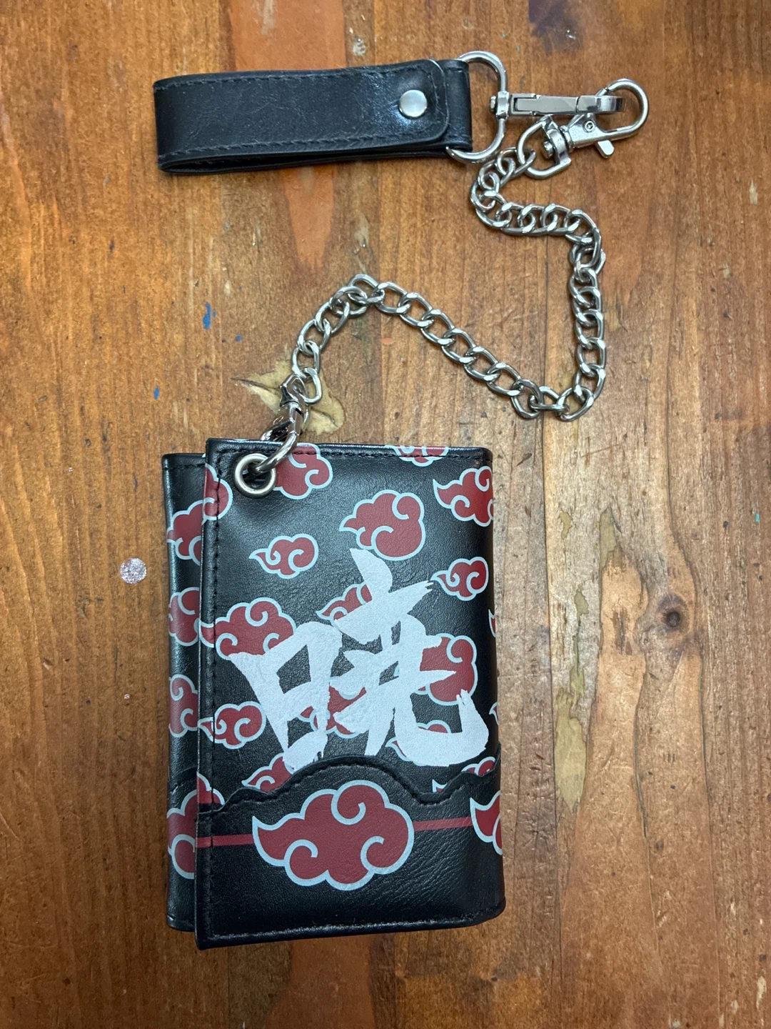 Tri-fold wallet featuring the iconic Akatsuki cloud pattern and Japanese characters. It's black with red and white accents. Includes a detachable chain and loop for secure attachment. Multiple card slots and a clear ID window are inside.