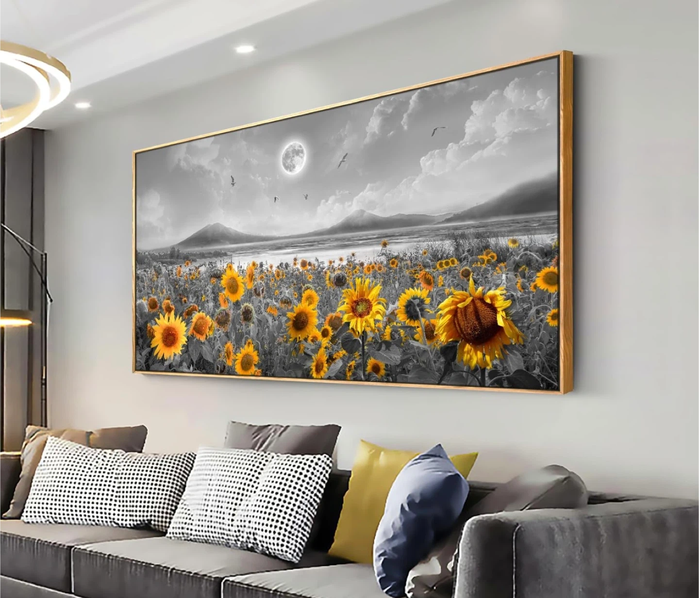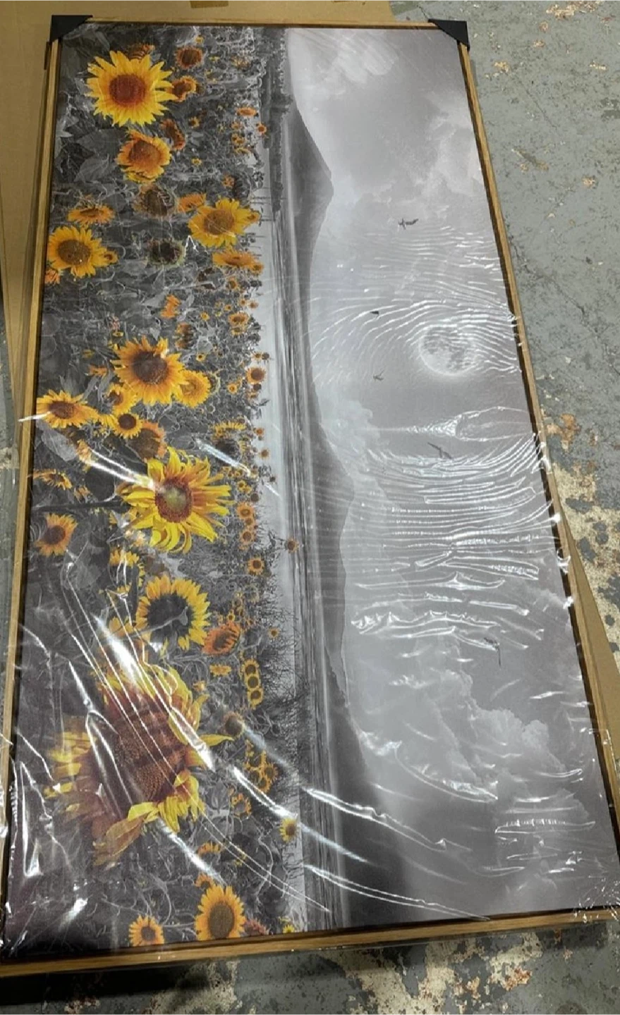 Adorn your living space with this striking, brand-new, factory-sealed sunflower framed wall art, measuring 50 inches by 20 inches, certain to infuse a touch of nature's beauty into any room. With its vivid depiction of sunflowers under a monochrome moonlit sky, this piece is more than just wall art; it's a conversation starter. Perfect for adding a splash of colour against neutral walls or complementing a nature-themed decor. This piece is new and has never been opened, waiting for the right home to bring joy and a breath of fresh air.