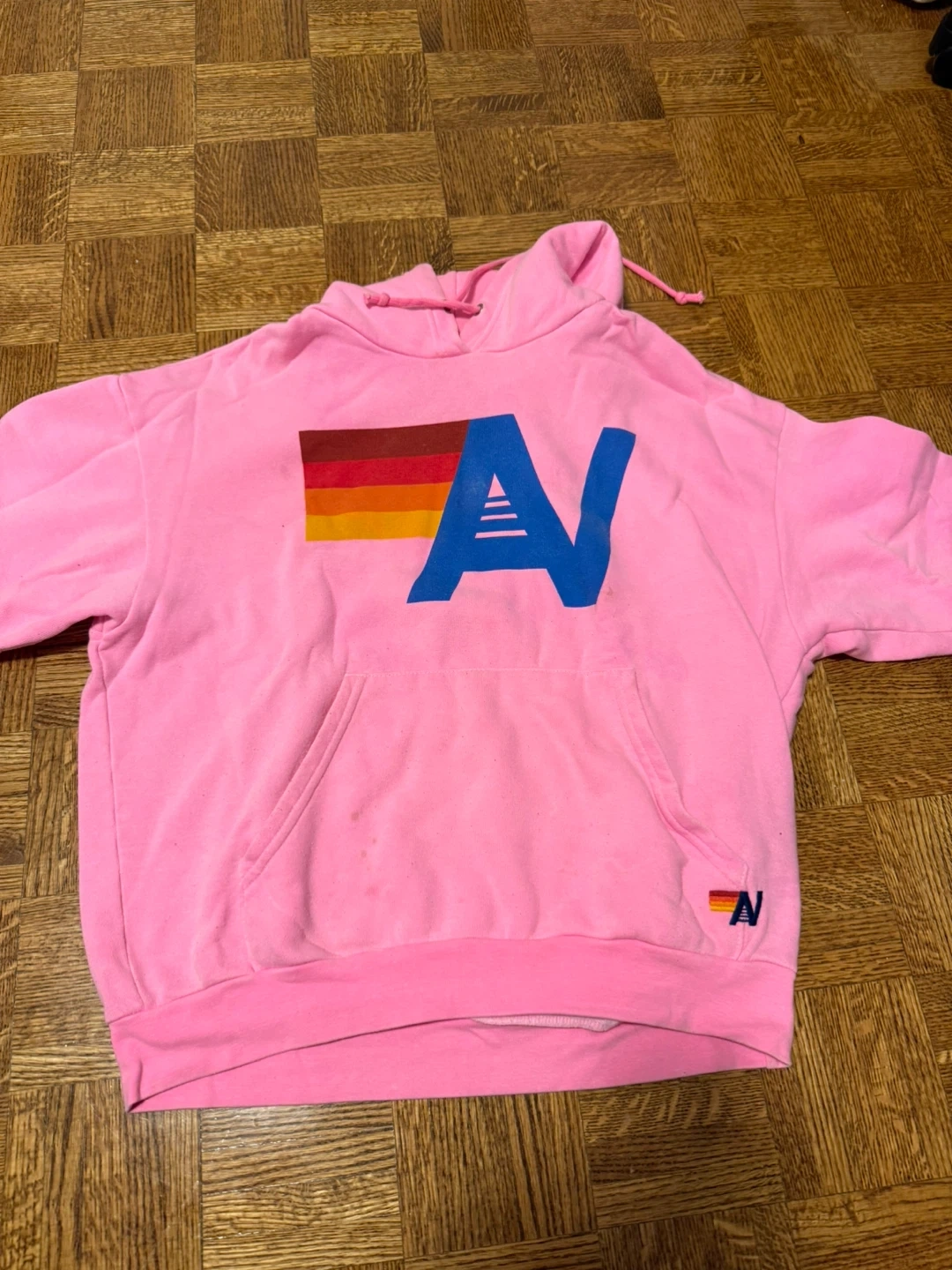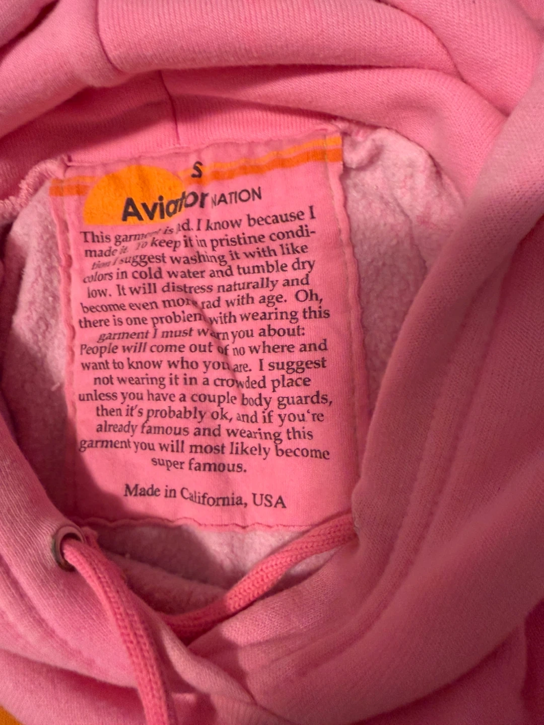 Selling a cute Aviator Nation hoodie in pink! It's a size small and has the signature Aviator Nation logo on the front. There are some stains on the front pocket, as shown in the photos.