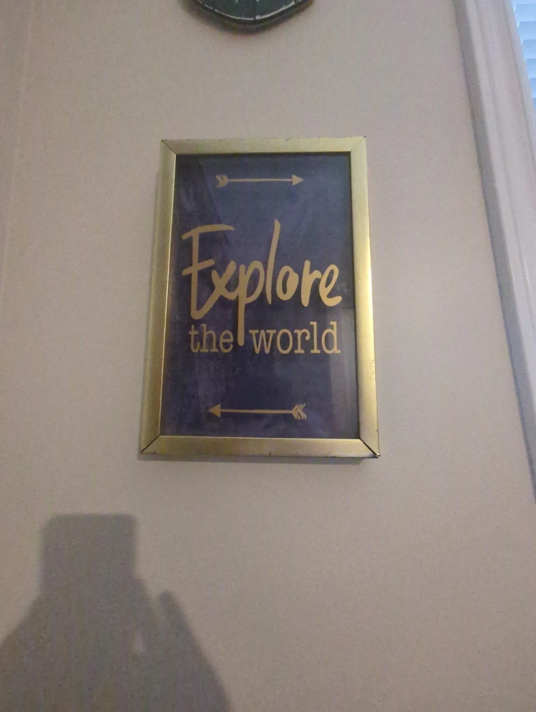 A framed piece of wall art with a blue world map background. The words "Explore the world" are written in a decorative font. It would be a great addition to any room!