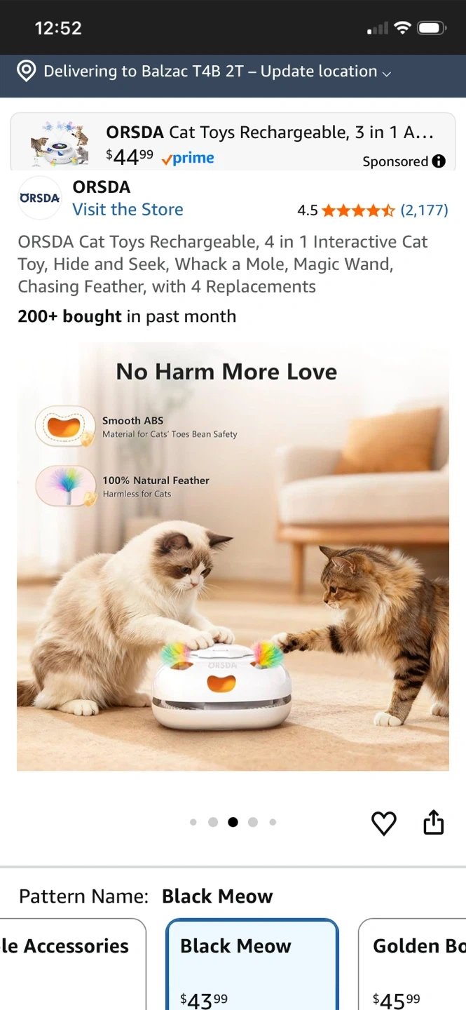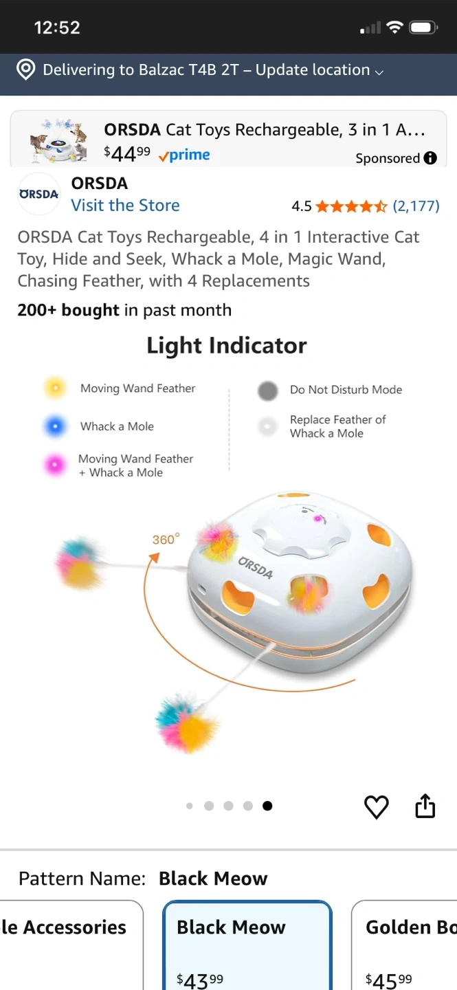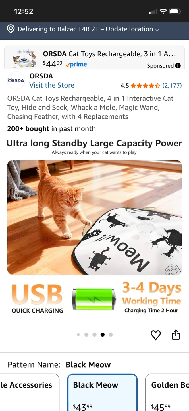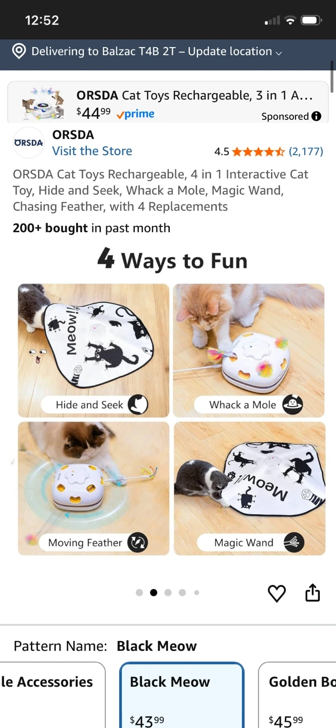 This ORSDA 4-in-1 interactive cat toy is rechargeable and offers multiple play modes including Hide and Seek, Whack a Mole, and Magic Wand. It comes with 4 replacements. Features include touch/voice activation and an auto-play timer. It's great for keeping your cat entertained!