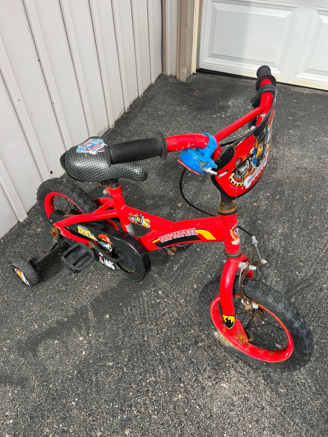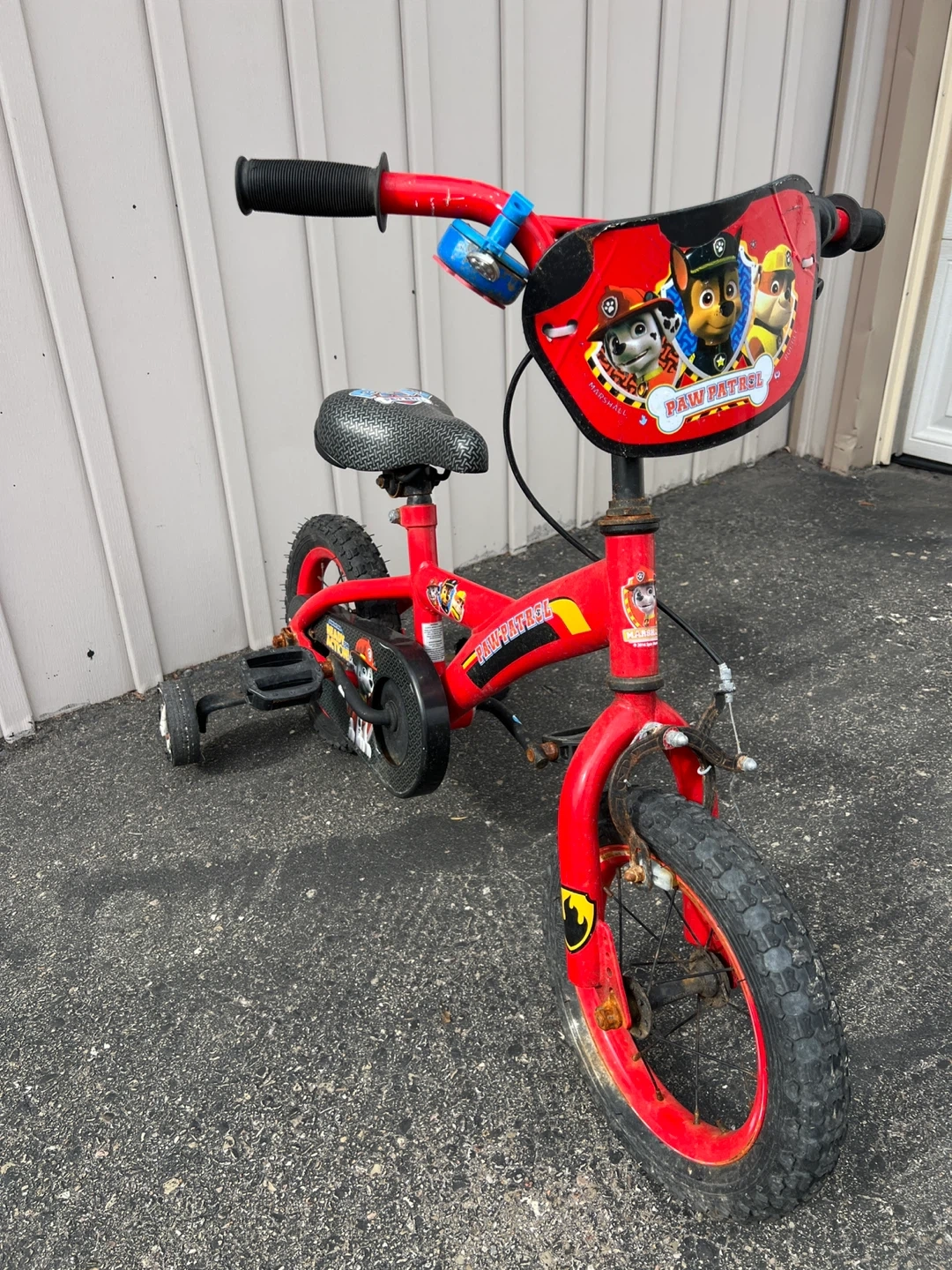 This is a red Paw Patrol kids' bike. It's equipped with training wheels for stability. The bike has a handlebar plaque featuring Paw Patrol characters.